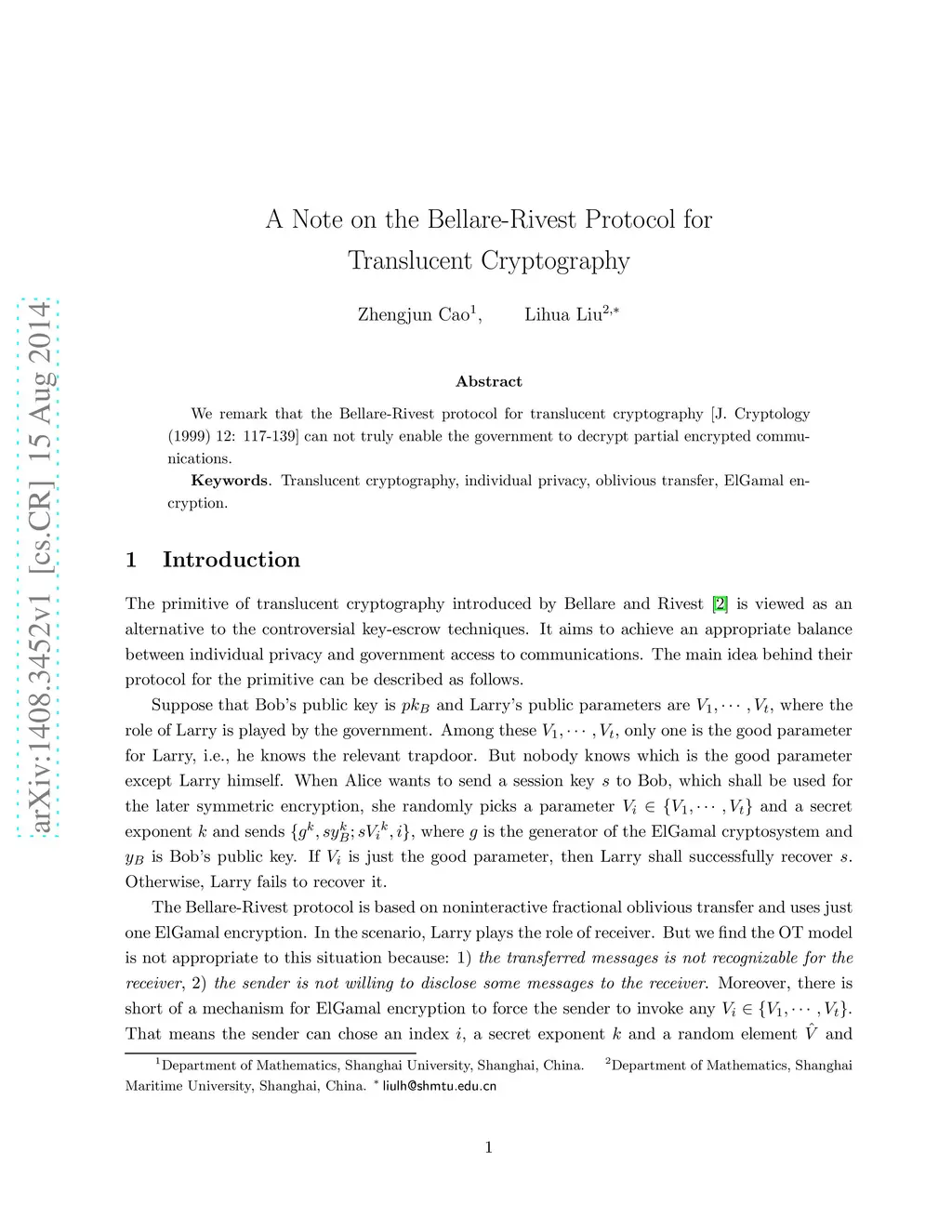 A Note on the Bellare-Rivest Protocol for Translucent Cryptography
