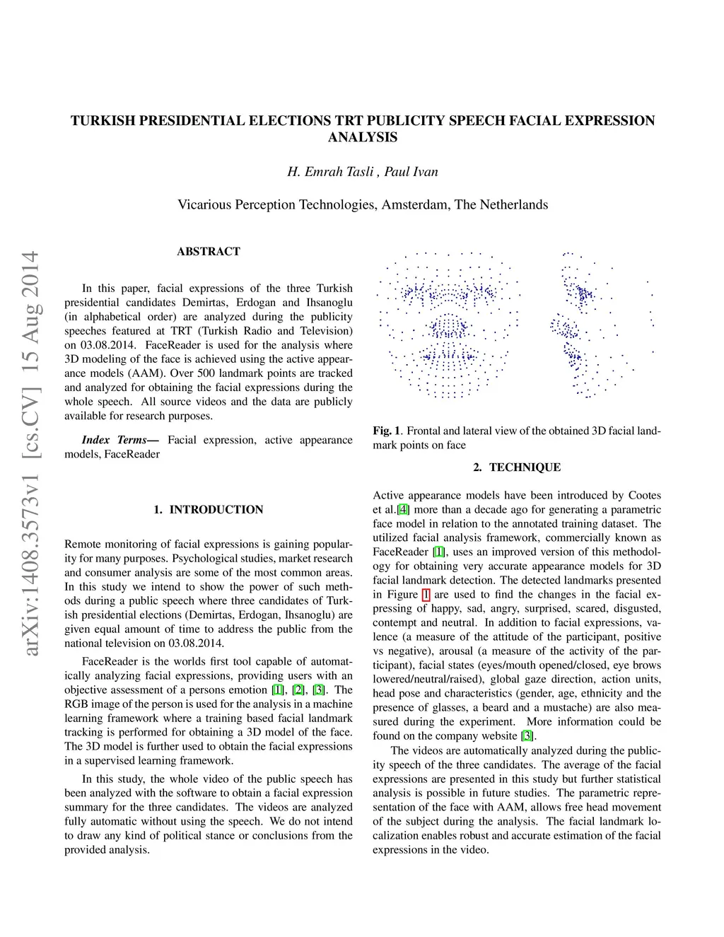 In this paper, facial expressions of the three Turkish presidential candidates Demirtas, Erdogan and Ihsanoglu (in alphabetical order) are analyzed during the publicity speeches featured at TRT (Turkish Radio and Television) on 03.08.2014. FaceReader is used for the analysis where 3D modeling of the face is achieved using the active appearance models (AAM). Over 500 landmark points are tracked and analyzed for obtaining the facial expressions during the whole speech. All source videos and the data are publicly available for research purposes.