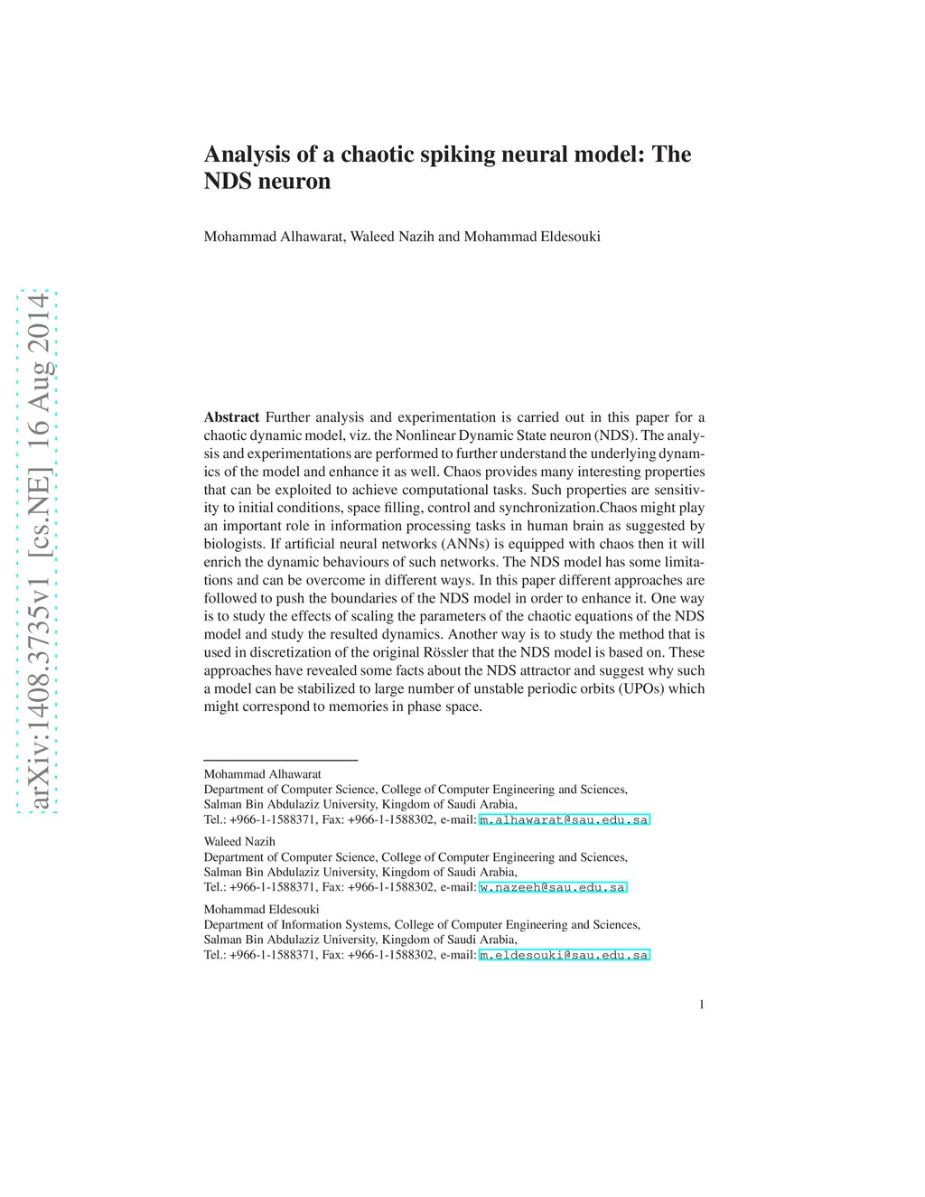 Analysis of a chaotic spiking neural model: The NDS neuron