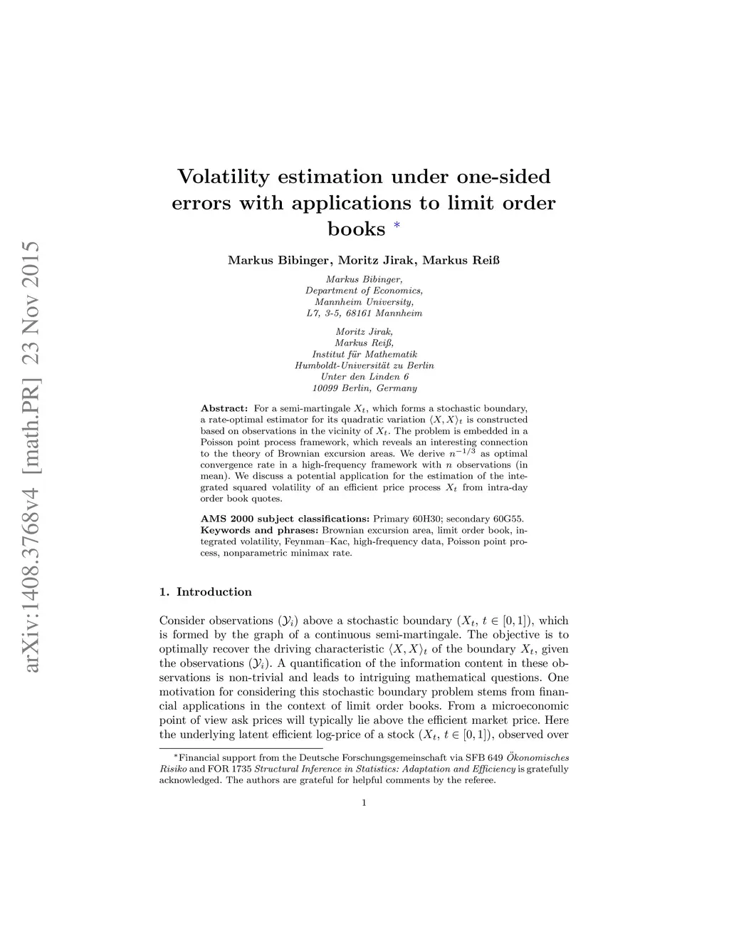 For a semi-martingale , which forms a stochastic boundary, a rate-optimal estimator for its quadratic variation is constructed based on observations in the vicinity of . The problem is embedded in a Poisson point process framework, which reveals an interesting connection to the theory of Brownian excursion areas. We derive as optimal convergence rate in a high-frequency framework with observations (in mean). We discuss a potential application for the estimation of the integrated squared volatility of an efficient price process from intra-day order book quotes.