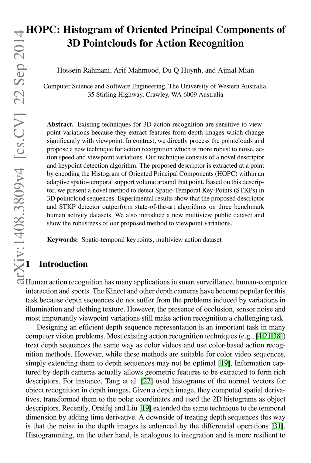 Existing techniques for 3D action recognition are sensitive to viewpoint variations because they extract features from depth images which change significantly with viewpoint. In contrast, we directly process the pointclouds and propose a new technique for action recognition which is more robust to noise, action speed and viewpoint variations. Our technique consists of a novel descriptor and keypoint detection algorithm. The proposed descriptor is extracted at a point by encoding the Histogram of Oriented Principal Components (HOPC) within an adaptive spatio-temporal support volume around that point. Based on this descriptor, we present a novel method to detect Spatio-Temporal Key-Points (STKPs) in 3D pointcloud sequences. Experimental results show that the proposed descriptor and STKP detector outperform state-of-the-art algorithms on three benchmark human activity datasets. We also introduce a new multiview public dataset and show the robustness of our proposed method to viewpoint variations.