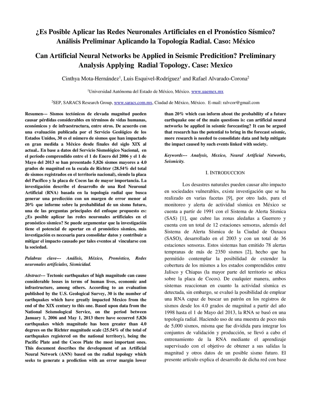 Tectonic earthquakes of high magnitude can cause considerable losses in terms of human lives, economic and infrastructure, among others. According to an evaluation published by the U.S. Geological Survey, 30 is the number of earthquakes which have greatly impacted Mexico from the end of the XIX century to this one. Based upon data from the National Seismological Service, on the period between January 1, 2006 and May 1, 2013 there have occurred 5,826 earthquakes which magnitude has been greater than 4.0 degrees on the Richter magnitude scale (25.54% of the total of earthquakes registered on the national territory), being the Pacific Plate and the Cocos Plate the most important ones. This document describes the development of an Artificial Neural Network (ANN) based on the radial topology which seeks to generate a prediction with an error margin lower than 20% which can inform about the probability of a future earthquake one of the main questions is: can artificial neural networks be applied in seismic forecasting? It can be argued that research has the potential to bring in the forecast seismic, more research is needed to consolidate data and help mitigate the impact caused by such events linked with society. Keywords--- Analysis, Mexico, Neural Artificial Networks, Seismicity.