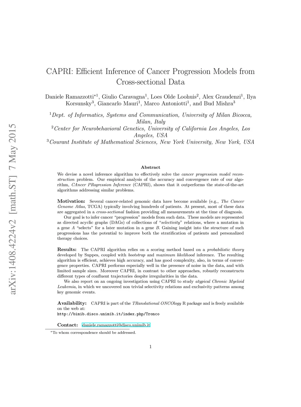 We devise a novel inference algorithm to effectively solve the cancer progression model reconstruction problem. Our empirical analysis of the accuracy and convergence rate of our algorithm, CAncer PRogression Inference (CAPRI), shows that it outperforms the state-of-the-art algorithms addressing similar problems. Motivation: Several cancer-related genomic data have become available (e.g., The Cancer Genome Atlas, TCGA) typically involving hundreds of patients. At present, most of these data are aggregated in a cross-sectional fashion providing all measurements at the time of diagnosis.Our goal is to infer cancer progression models from such data. These models are represented as directed acyclic graphs (DAGs) of collections of selectivity relations, where a mutation in a gene A selects for a later mutation in a gene B. Gaining insight into the structure of such progressions has the potential to improve both the stratification of patients and personalized therapy choices. Results: The CAPRI algorithm relies on a scoring method based on a probabilistic theory developed by Suppes, coupled with bootstrap and maximum likelihood inference. The resulting algorithm is efficient, achieves high accuracy, and has good complexity, also, in terms of convergence properties. CAPRI performs especially well in the presence of noise in the data, and with limited sample sizes. Moreover CAPRI, in contrast to other approaches, robustly reconstructs different types of confluent trajectories despite irregularities in the data.We also report on an ongoing investigation using CAPRI to study atypical Chronic Myeloid Leukemia, in which we uncovered non trivial selectivity relations and exclusivity patterns among key genomic events.
