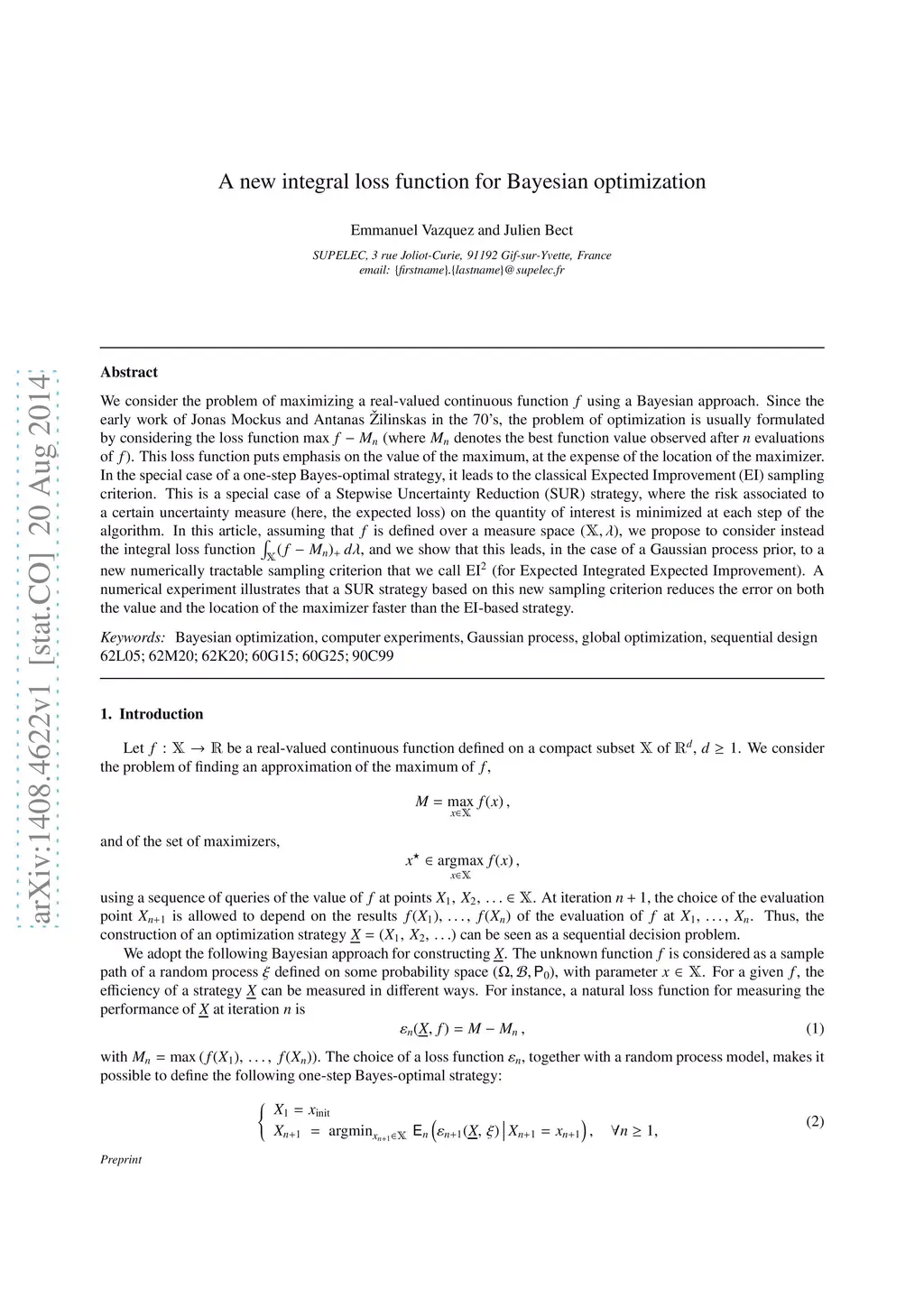 We consider the problem of maximizing a real-valued continuous function using a Bayesian approach. Since the early work of Jonas Mockus and Antanas \v{Z}ilinskas in the 70's, the problem of optimization is usually formulated by considering the loss function (where denotes the best function value observed after evaluations of ). This loss function puts emphasis on the value of the maximum, at the expense of the location of the maximizer. In the special case of a one-step Bayes-optimal strategy, it leads to the classical Expected Improvement (EI) sampling criterion. This is a special case of a Stepwise Uncertainty Reduction (SUR) strategy, where the risk associated to a certain uncertainty measure (here, the expected loss) on the quantity of interest is minimized at each step of the algorithm. In this article, assuming that is defined over a measure space , we propose to consider instead the integral loss function , and we show that this leads, in the case of a Gaussian process prior, to a new numerically tractable sampling criterion that we call (for Expected Integrated Expected Improvement). A numerical experiment illustrates that a SUR strategy based on this new sampling criterion reduces the error on both the value and the location of the maximizer faster than the EI-based strategy.
