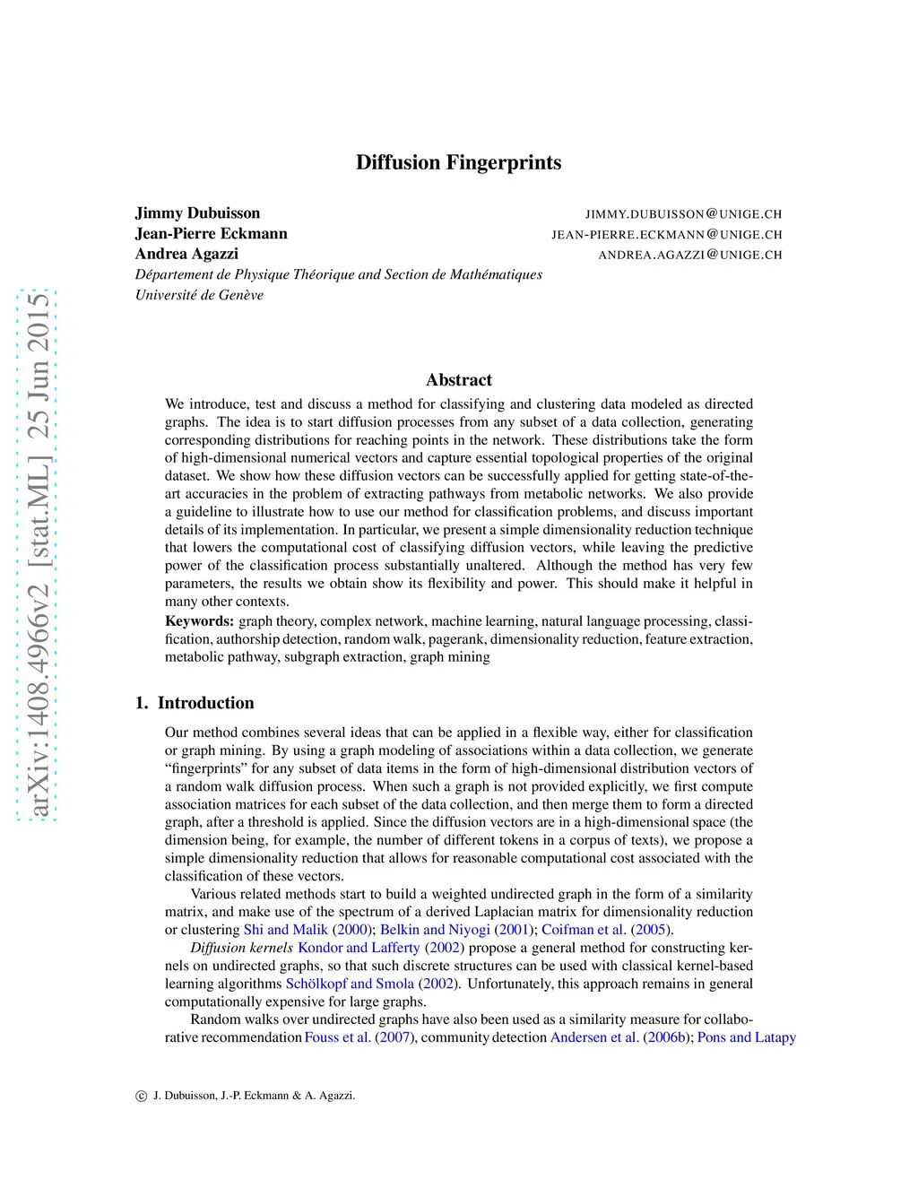 We introduce, test and discuss a method for classifying and clustering data modeled as directed graphs. The idea is to start diffusion processes from any subset of a data collection, generating corresponding distributions for reaching points in the network. These distributions take the form of high-dimensional numerical vectors and capture essential topological properties of the original dataset. We show how these diffusion vectors can be successfully applied for getting state-of-the-art accuracies in the problem of extracting pathways from metabolic networks. We also provide a guideline to illustrate how to use our method for classification problems, and discuss important details of its implementation. In particular, we present a simple dimensionality reduction technique that lowers the computational cost of classifying diffusion vectors, while leaving the predictive power of the classification process substantially unaltered. Although the method has very few parameters, the results we obtain show its flexibility and power. This should make it helpful in many other contexts.