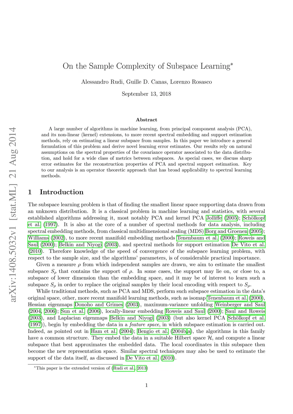 A large number of algorithms in machine learning, from principal component analysis (PCA), and its non-linear (kernel) extensions, to more recent spectral embedding and support estimation methods, rely on estimating a linear subspace from samples. In this paper we introduce a general formulation of this problem and derive novel learning error estimates. Our results rely on natural assumptions on the spectral properties of the covariance operator associated to the data distribu- tion, and hold for a wide class of metrics between subspaces. As special cases, we discuss sharp error estimates for the reconstruction properties of PCA and spectral support estimation. Key to our analysis is an operator theoretic approach that has broad applicability to spectral learning methods.