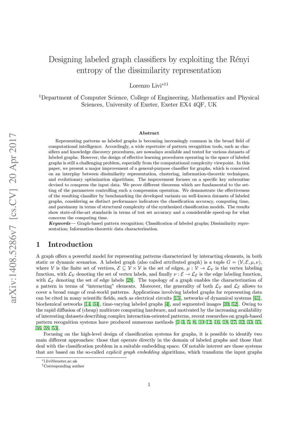 Representing patterns as labeled graphs is becoming increasingly common in the broad field of computational intelligence. Accordingly, a wide repertoire of pattern recognition tools, such as classifiers and knowledge discovery procedures, are nowadays available and tested for various datasets of labeled graphs. However, the design of effective learning procedures operating in the space of labeled graphs is still a challenging problem, especially from the computational complexity viewpoint. In this paper, we present a major improvement of a general-purpose classifier for graphs, which is conceived on an interplay between dissimilarity representation, clustering, information-theoretic techniques, and evolutionary optimization algorithms. The improvement focuses on a specific key subroutine devised to compress the input data. We prove different theorems which are fundamental to the setting of the parameters controlling such a compression operation. We demonstrate the effectiveness of the resulting classifier by benchmarking the developed variants on well-known datasets of labeled graphs, considering as distinct performance indicators the classification accuracy, computing time, and parsimony in terms of structural complexity of the synthesized classification models. The results show state-of-the-art standards in terms of test set accuracy and a considerable speed-up for what concerns the computing time.