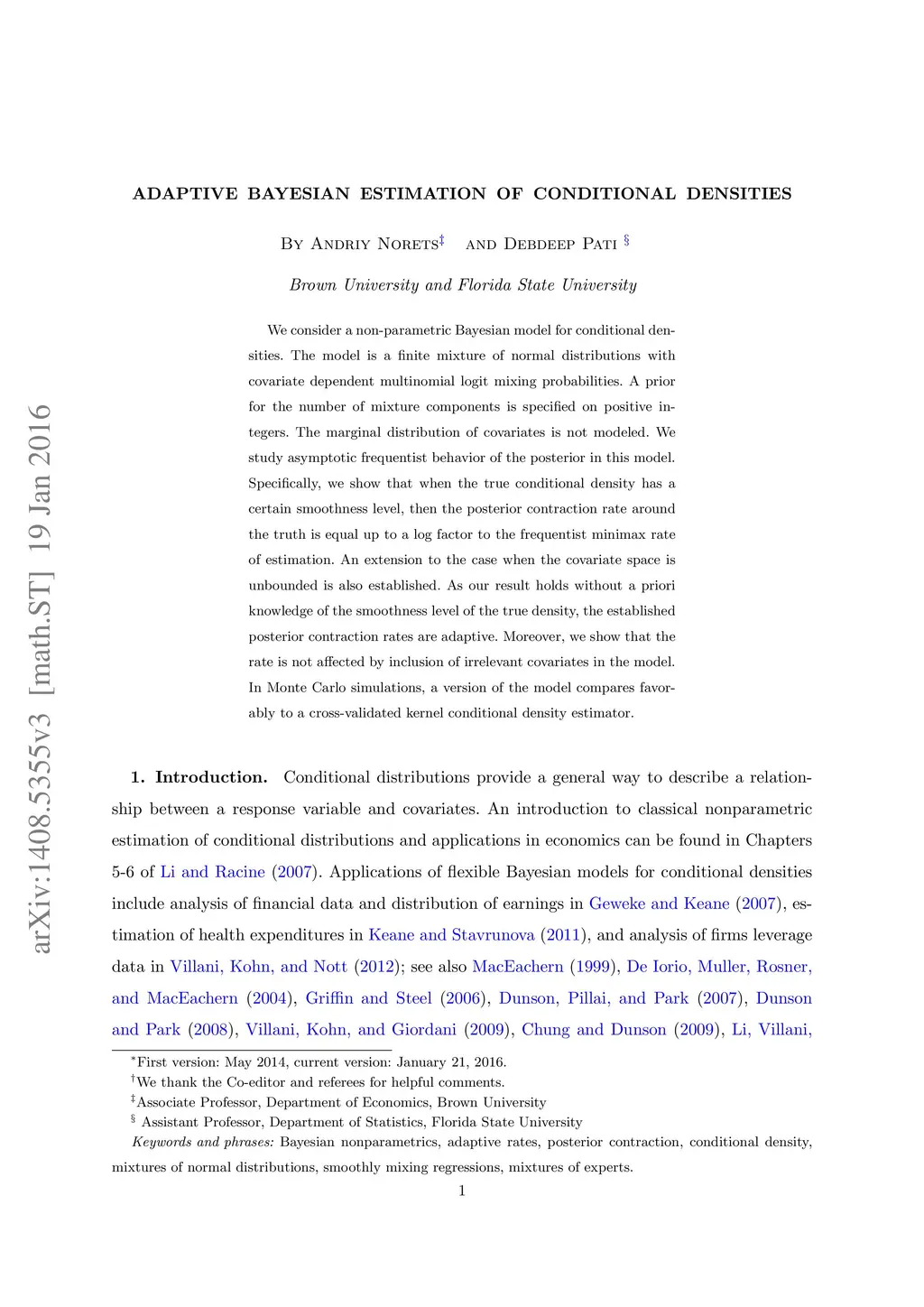 We consider a non-parametric Bayesian model for conditional densities. The model is a finite mixture of normal distributions with covariate dependent multinomial logit mixing probabilities. A prior for the number of mixture components is specified on positive integers. The marginal distribution of covariates is not modeled. We study asymptotic frequentist behavior of the posterior in this model. Specifically, we show that when the true conditional density has a certain smoothness level, then the posterior contraction rate around the truth is equal up to a log factor to the frequentist minimax rate of estimation. An extension to the case when the covariate space is unbounded is also established. As our result holds without a priori knowledge of the smoothness level of the true density, the established posterior contraction rates are adaptive. Moreover, we show that the rate is not affected by inclusion of irrelevant covariates in the model. In Monte Carlo simulations, a version of the model compares favorably to a cross-validated kernel conditional density estimator.