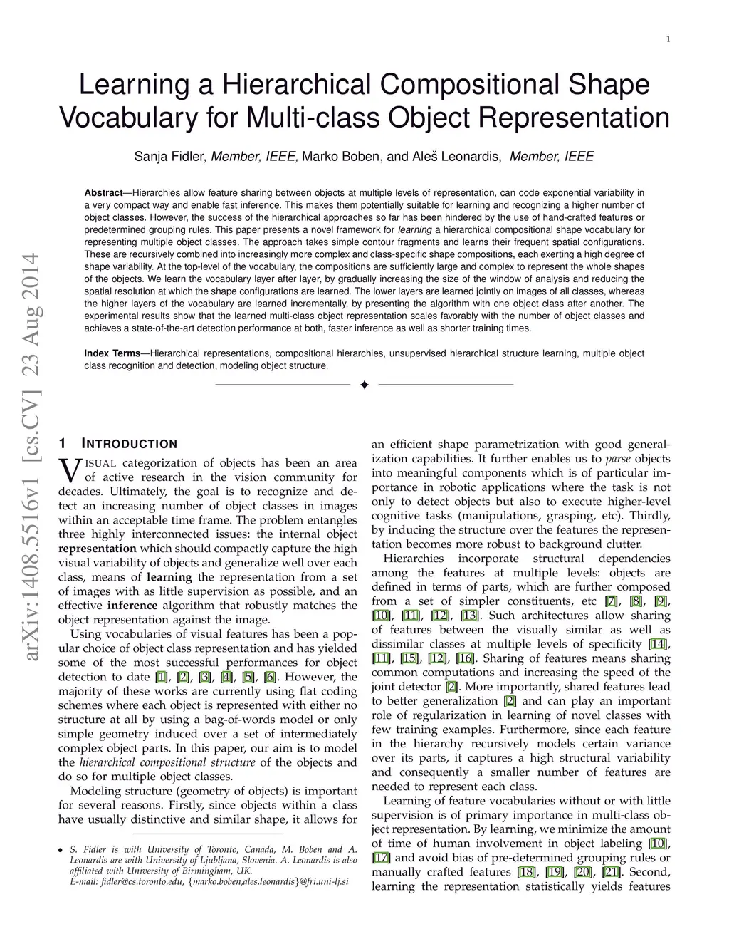 Hierarchies allow feature sharing between objects at multiple levels of representation, can code exponential variability in a very compact way and enable fast inference. This makes them potentially suitable for learning and recognizing a higher number of object classes. However, the success of the hierarchical approaches so far has been hindered by the use of hand-crafted features or predetermined grouping rules. This paper presents a novel framework for learning a hierarchical compositional shape vocabulary for representing multiple object classes. The approach takes simple contour fragments and learns their frequent spatial configurations. These are recursively combined into increasingly more complex and class-specific shape compositions, each exerting a high degree of shape variability. At the top-level of the vocabulary, the compositions are sufficiently large and complex to represent the whole shapes of the objects. We learn the vocabulary layer after layer, by gradually increasing the size of the window of analysis and reducing the spatial resolution at which the shape configurations are learned. The lower layers are learned jointly on images of all classes, whereas the higher layers of the vocabulary are learned incrementally, by presenting the algorithm with one object class after another. The experimental results show that the learned multi-class object representation scales favorably with the number of object classes and achieves a state-of-the-art detection performance at both, faster inference as well as shorter training times.
