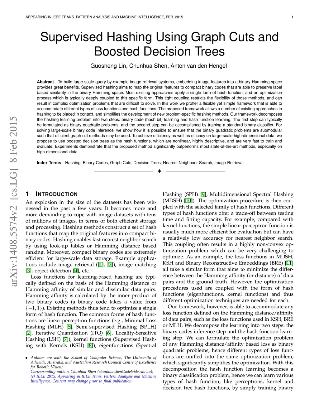 Supervised Hashing Using Graph Cuts and Boosted Decision Trees