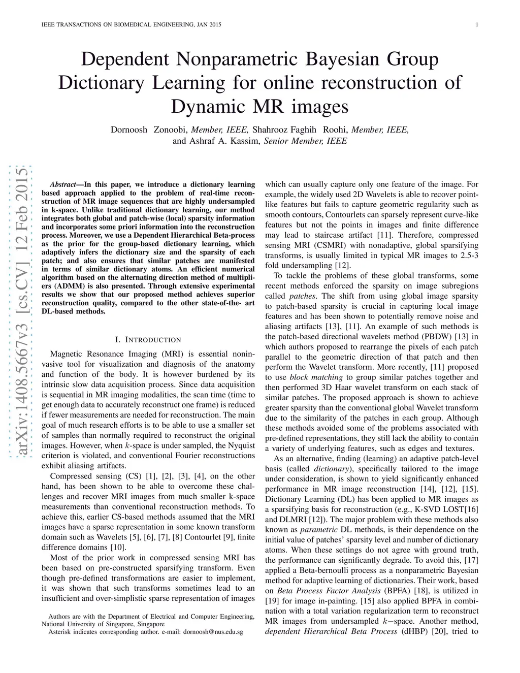 In this paper, we introduce a dictionary learning based approach applied to the problem of real-time reconstruction of MR image sequences that are highly undersampled in k-space. Unlike traditional dictionary learning, our method integrates both global and patch-wise (local) sparsity information and incorporates some priori information into the reconstruction process. Moreover, we use a Dependent Hierarchical Beta-process as the prior for the group-based dictionary learning, which adaptively infers the dictionary size and the sparsity of each patch; and also ensures that similar patches are manifested in terms of similar dictionary atoms. An efficient numerical algorithm based on the alternating direction method of multipliers (ADMM) is also presented. Through extensive experimental results we show that our proposed method achieves superior reconstruction quality, compared to the other state-of-the- art DL-based methods.