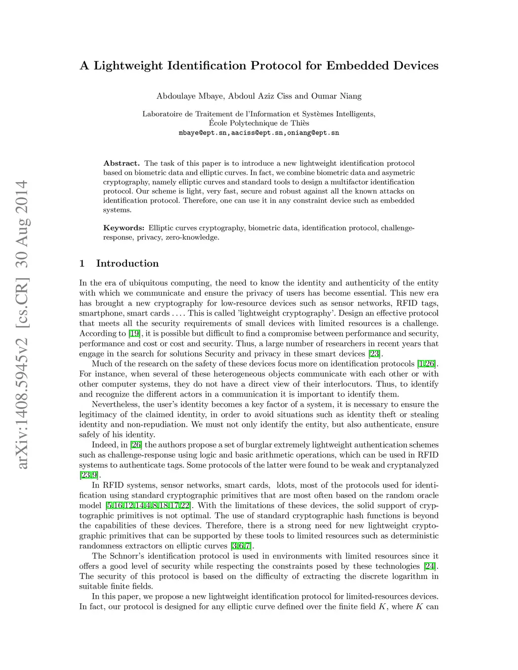 The task of this paper is to introduce a new lightweight identification protocol based on biometric data and elliptic curves. In fact, we combine biometric data and asymetric cryptography, namely elliptic curves and standard tools to design a multifactor identification protocol. Our scheme is light, very fast, secure and robust against all the known attacks on identification protocol. Therefore, one can use it in any constraint device such as embedded systems.
