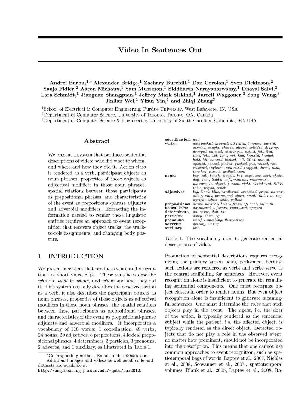 We present a system that produces sentential descriptions of video: who did what to whom, and where and how they did it. Action class is rendered as a verb, participant objects as noun phrases, properties of those objects as adjectival modifiers in those noun phrases, spatial relations between those participants as prepositional phrases, and characteristics of the event as prepositional-phrase adjuncts and adverbial modifiers. Extracting the information needed to render these linguistic entities requires an approach to event recognition that recovers object tracks, the trackto-role assignments, and changing body posture.