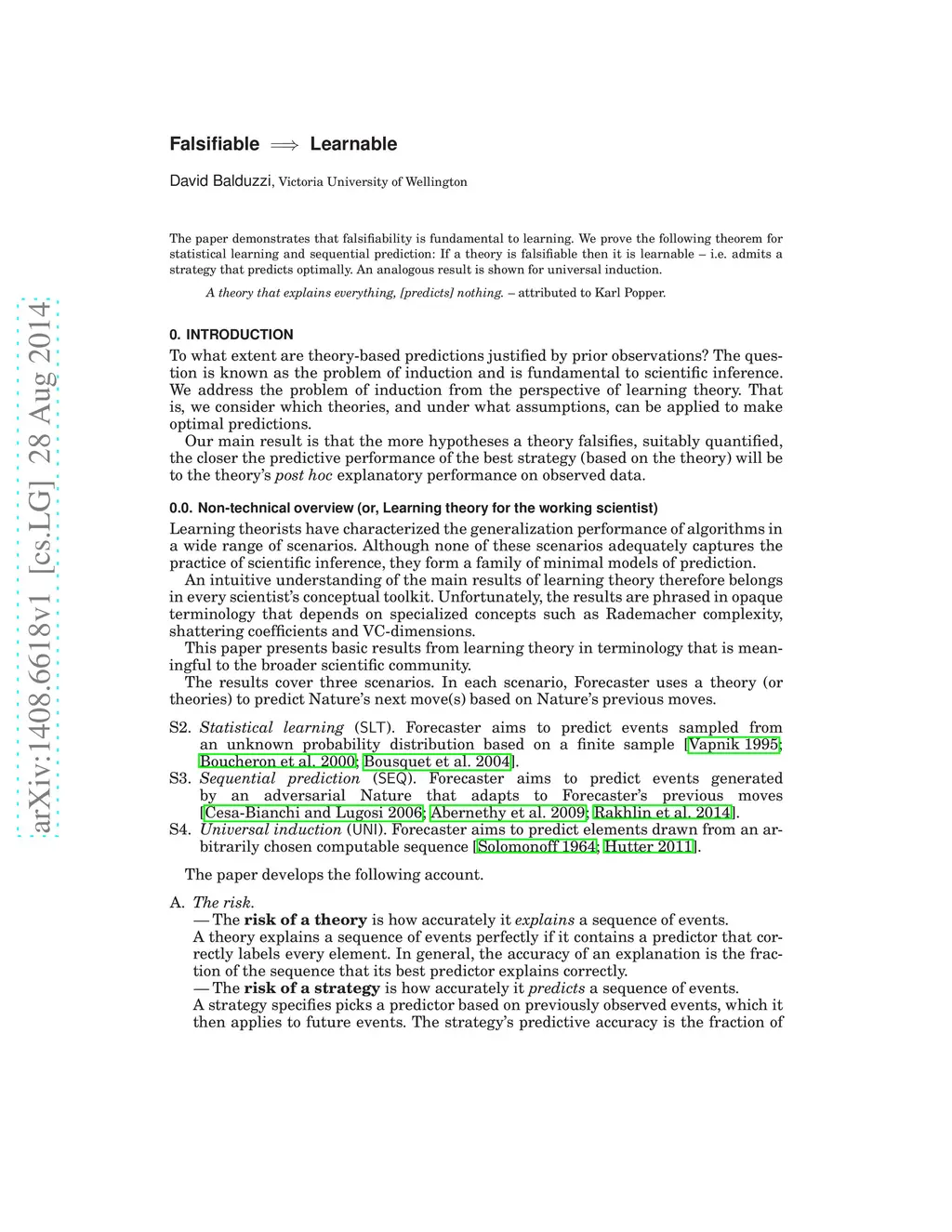 The paper demonstrates that falsifiability is fundamental to learning. We prove the following theorem for statistical learning and sequential prediction: If a theory is falsifiable then it is learnable -- i.e. admits a strategy that predicts optimally. An analogous result is shown for universal induction.