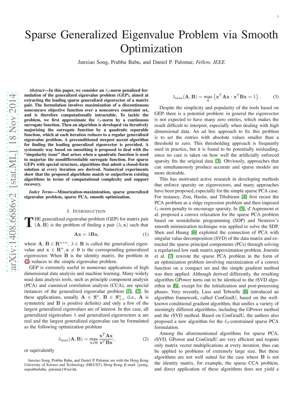 In this paper, we consider an -norm penalized formulation of the generalized eigenvalue problem (GEP), aimed at extracting the leading sparse generalized eigenvector of a matrix pair. The formulation involves maximization of a discontinuous nonconcave objective function over a nonconvex constraint set, and is therefore computationally intractable. To tackle the problem, we first approximate the -norm by a continuous surrogate function. Then an algorithm is developed via iteratively majorizing the surrogate function by a quadratic separable function, which at each iteration reduces to a regular generalized eigenvalue problem. A preconditioned steepest ascent algorithm for finding the leading generalized eigenvector is provided. A systematic way based on smoothing is proposed to deal with the "singularity issue" that arises when a quadratic function is used to majorize the nondifferentiable surrogate function. For sparse GEPs with special structure, algorithms that admit a closed-form solution at every iteration are derived. Numerical experiments show that the proposed algorithms match or outperform existing algorithms in terms of computational complexity and support recovery.