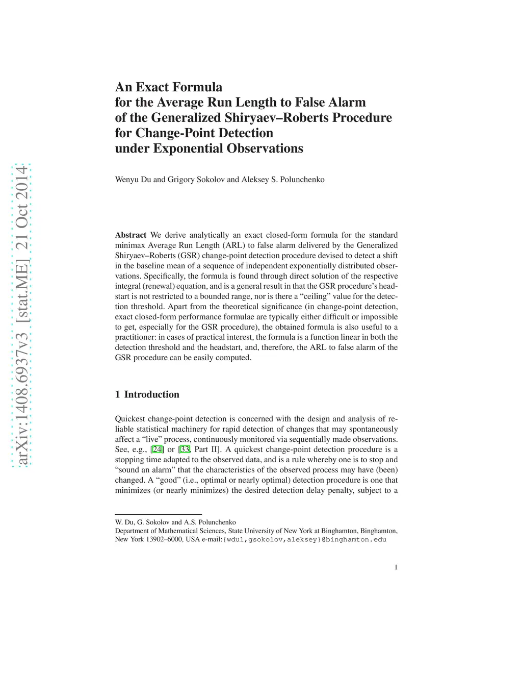 We derive analytically an exact closed-form formula for the standard minimax Average Run Length (ARL) to false alarm delivered by the Generalized Shiryaev-Roberts (GSR) change-point detection procedure devised to detect a shift in the baseline mean of a sequence of independent exponentially distributed observations. Specifically, the formula is found through direct solution of the respective integral (renewal) equation, and is a general result in that the GSR procedure's headstart is not restricted to a bounded range, nor is there a "ceiling" value for the detection threshold. Apart from the theoretical significance (in change-point detection, exact closed-form performance formulae are typically either difficult or impossible to get, especially for the GSR procedure), the obtained formula is also useful to a practitioner: in cases of practical interest, the formula is a function linear in both the detection threshold and the headstart, and, therefore, the ARL to false alarm of the GSR procedure can be easily computed.