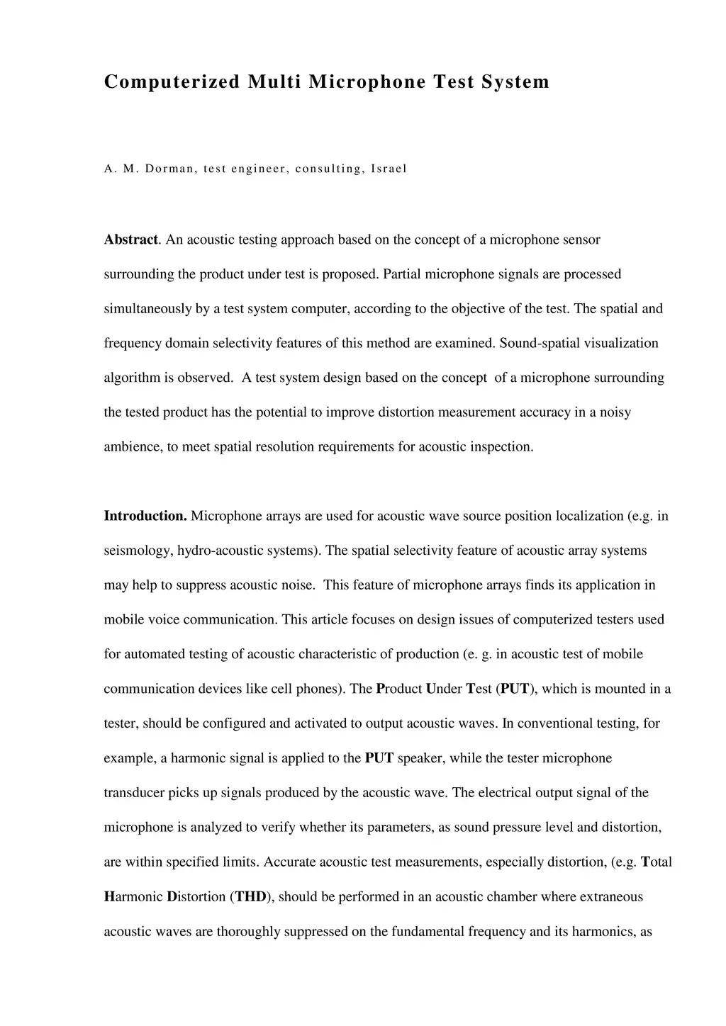 An acoustic testing approach based on the concept of a microphone sensor surrounding the product under test is proposed. Microphone signals are processed simultaneously by a test system computer, according to the objective of the test. The spatial and frequency domain selectivity features of this method are examined. Sound-spatial visualization algorithm is observed. A test system design based on the concept of a microphone surrounding the tested product has the potential to improve distortion measurement accuracy.