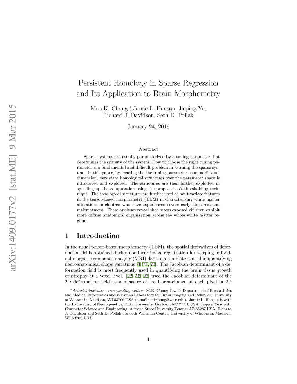 Sparse systems are usually parameterized by a tuning parameter that determines the sparsity of the system. How to choose the right tuning parameter is a fundamental and difficult problem in learning the sparse system. In this paper, by treating the the tuning parameter as an additional dimension, persistent homological structures over the parameter space is introduced and explored. The structures are then further exploited in speeding up the computation using the proposed soft-thresholding technique. The topological structures are further used as multivariate features in the tensor-based morphometry (TBM) in characterizing white matter alterations in children who have experienced severe early life stress and maltreatment. These analyses reveal that stress-exposed children exhibit more diffuse anatomical organization across the whole white matter region.