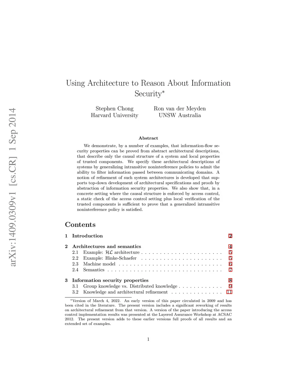 We demonstrate, by a number of examples, that information-flow security properties can be proved from abstract architectural descriptions, that describe only the causal structure of a system and local properties of trusted components. We specify these architectural descriptions of systems by generalizing intransitive noninterference policies to admit the ability to filter information passed between communicating domains. A notion of refinement of such system architectures is developed that supports top-down development of architectural specifications and proofs by abstraction of information security properties. We also show that, in a concrete setting where the causal structure is enforced by access control, a static check of the access control setting plus local verification of the trusted components is sufficient to prove that a generalized intransitive noninterference policy is satisfied.