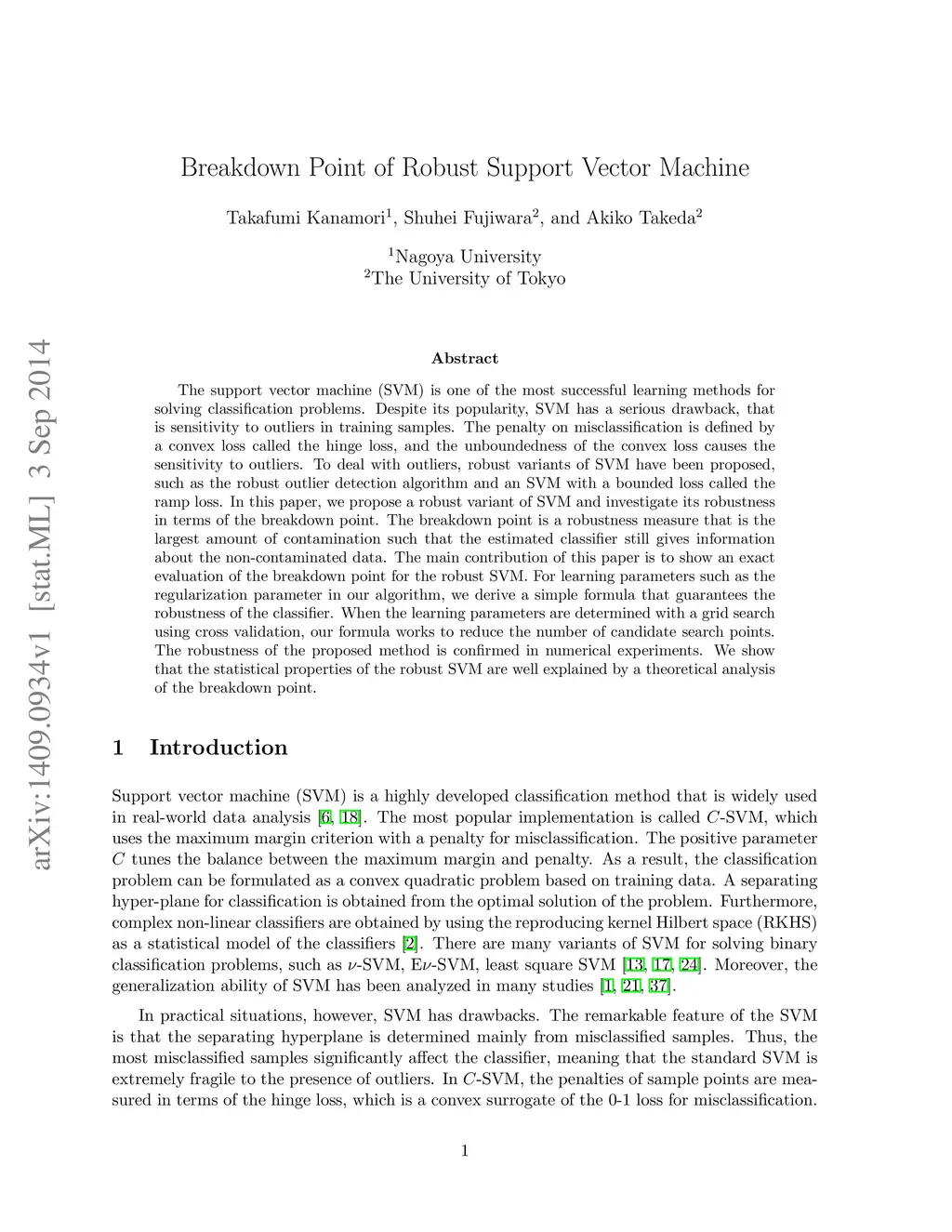 The support vector machine (SVM) is one of the most successful learning methods for solving classification problems. Despite its popularity, SVM has a serious drawback, that is sensitivity to outliers in training samples. The penalty on misclassification is defined by a convex loss called the hinge loss, and the unboundedness of the convex loss causes the sensitivity to outliers. To deal with outliers, robust variants of SVM have been proposed, such as the robust outlier detection algorithm and an SVM with a bounded loss called the ramp loss. In this paper, we propose a robust variant of SVM and investigate its robustness in terms of the breakdown point. The breakdown point is a robustness measure that is the largest amount of contamination such that the estimated classifier still gives information about the non-contaminated data. The main contribution of this paper is to show an exact evaluation of the breakdown point for the robust SVM. For learning parameters such as the regularization parameter in our algorithm, we derive a simple formula that guarantees the robustness of the classifier. When the learning parameters are determined with a grid search using cross validation, our formula works to reduce the number of candidate search points. The robustness of the proposed method is confirmed in numerical experiments. We show that the statistical properties of the robust SVM are well explained by a theoretical analysis of the breakdown point.