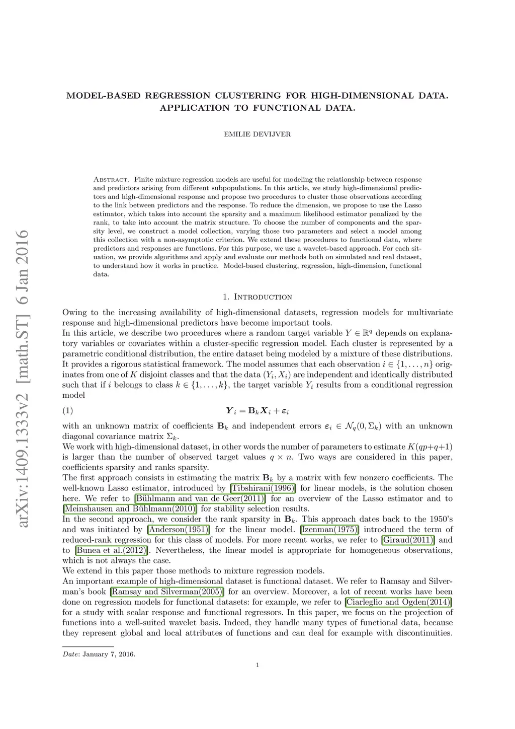 Finite mixture regression models are useful for modeling the relationship between response and predictors, arising from different subpopulations. In this article, we study high-dimensional predic- tors and high-dimensional response, and propose two procedures to deal with this issue. We propose to use the Lasso estimator to take into account the sparsity, and a penalty on the rank, to take into account the matrix structure. Then, we extend these procedures to the functional case, where predictors and responses are functions. For this purpose, we use a wavelet-based approach. Finally, for each situation, we provide algorithms, and apply and evaluate our methods both on simulations and real datasets.