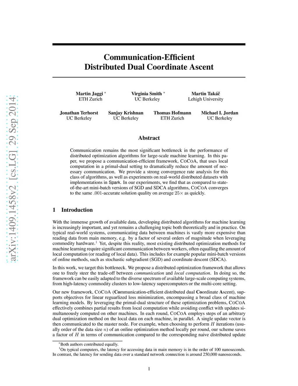 Communication-Efficient Distributed Dual Coordinate Ascent