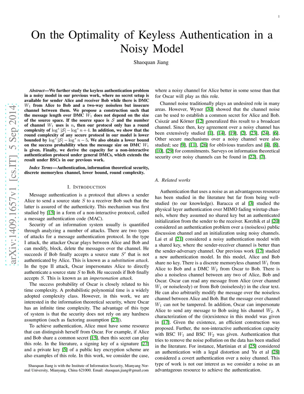 We further study the keyless authentication problem in a noisy model in our previous work, where no secret setup is available for sender Alice and receiver Bob while there is DMC from Alice to Bob and a two-way noiseless but insecure channel between them. We propose a construction such that the message length over DMC does not depend on the size of the source space. If the source space is and the number of channel uses is , then our protocol only has a round complexity of In addition, we show that the round complexity of any secure protocol in our model is lower bounded by . We also obtain a lower bound on the success probability when the message size on DMC is given. Finally, we derive the capacity for a non-interactive authentication protocol under general DMCs, which extends the result under BSCs in our previous work.