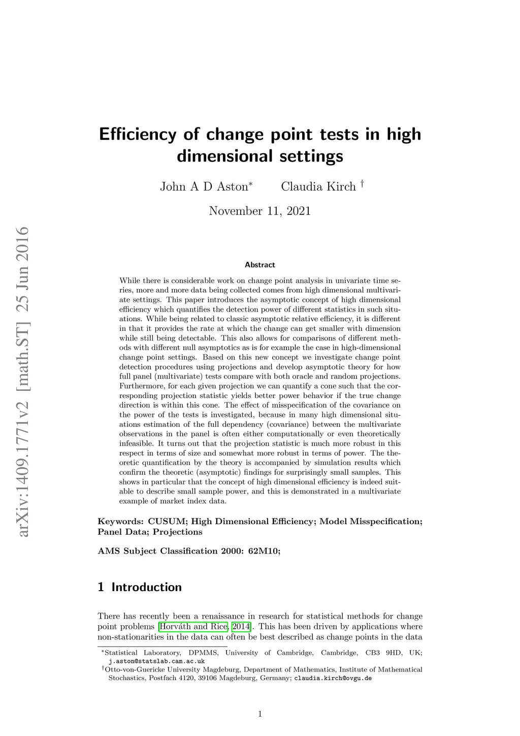 While there is considerable work on change point analysis in univariate time series, more and more data being collected comes from high dimensional multivariate settings. This paper introduces the asymptotic concept of high dimensional efficiency which quantifies the detection power of different statistics in such situations. While being related to classic asymptotic relative efficiency, it is different in that it provides the rate at which the change can get smaller with dimension while still being detectable. This also allows for comparisons of different methods with different null asymptotics as is for example the case in high-dimensional change point settings. Based on this new concept we investigate change point detection procedures using projections and develop asymptotic theory for how full panel (multivariate) tests compare with both oracle and random projections. Furthermore, for each given projection we can quantify a cone such that the corresponding projection statistic yields better power behavior if the true change direction is within this cone. The effect of misspecification of the covariance on the power of the tests is investigated, because in many high dimensional situations estimation of the full dependency (covariance) between the multivariate observations in the panel is often either computationally or even theoretically infeasible. It turns out that the projection statistic is much more robust in this respect in terms of size and somewhat more robust in terms of power. The theoretic quantification by the theory is accompanied by simulation results which confirm the theoretic (asymptotic) findings for surprisingly small samples. This shows in particular that the concept of high dimensional efficiency is indeed suitable to describe small sample power, and this is demonstrated in a multivariate example of market index data.