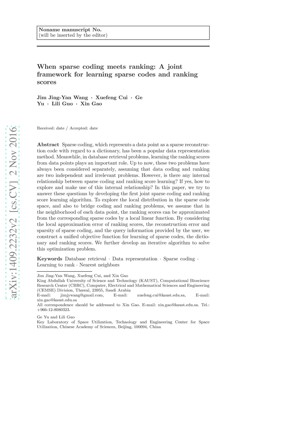Sparse coding, which represents a data point as a sparse reconstruction code with regard to a dictionary, has been a popular data representation method. Meanwhile, in database retrieval problems, learning the ranking scores from data points plays an important role. Up to now, these two problems have always been considered separately, assuming that data coding and ranking are two independent and irrelevant problems. However, is there any internal relationship between sparse coding and ranking score learning? If yes, how to explore and make use of this internal relationship? In this paper, we try to answer these questions by developing the first joint sparse coding and ranking score learning algorithm. To explore the local distribution in the sparse code space, and also to bridge coding and ranking problems, we assume that in the neighborhood of each data point, the ranking scores can be approximated from the corresponding sparse codes by a local linear function. By considering the local approximation error of ranking scores, the reconstruction error and sparsity of sparse coding, and the query information provided by the user, we construct a unified objective function for learning of sparse codes, the dictionary and ranking scores. We further develop an iterative algorithm to solve this optimization problem.