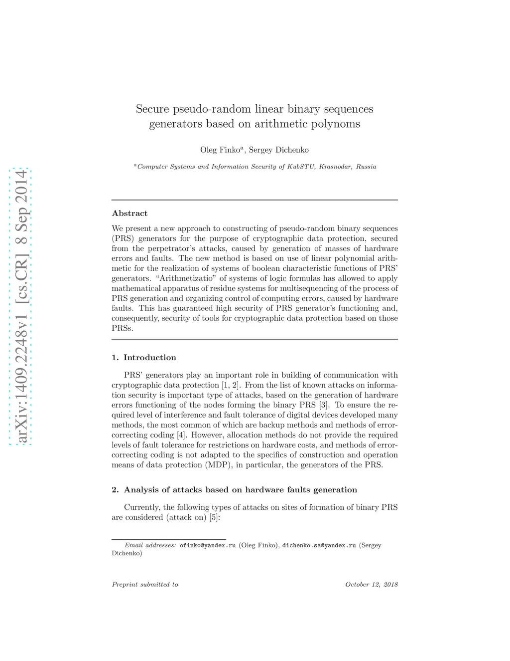 We present a new approach to constructing of pseudo-random binary sequences (PRS) generators for the purpose of cryptographic data protection, secured from the perpetrator's attacks, caused by generation of masses of hardware errors and faults. The new method is based on use of linear polynomial arithmetic for the realization of systems of boolean characteristic functions of PRS' generators. "Arithmetizatio" of systems of logic formulas has allowed to apply mathematical apparatus of residue systems for multisequencing of the process of PRS generation and organizing control of computing errors, caused by hardware faults. This has guaranteed high security of PRS generator's functioning and, consequently, security of tools for cryptographic data protection based on those PRSs.