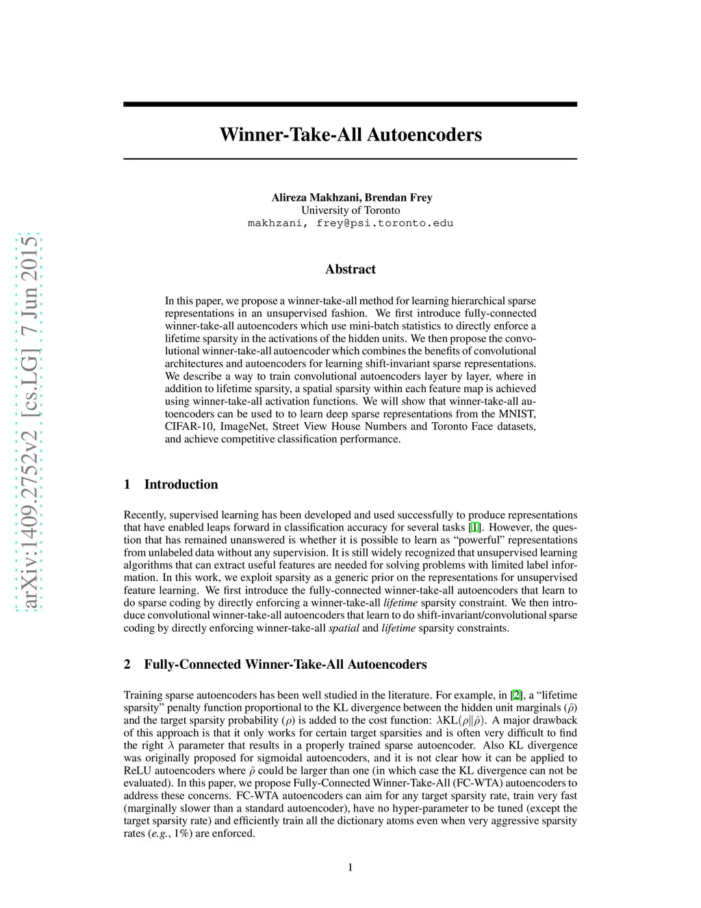 In this paper, we propose a winner-take-all method for learning hierarchical sparse representations in an unsupervised fashion. We first introduce fully-connected winner-take-all autoencoders which use mini-batch statistics to directly enforce a lifetime sparsity in the activations of the hidden units. We then propose the convolutional winner-take-all autoencoder which combines the benefits of convolutional architectures and autoencoders for learning shift-invariant sparse representations. We describe a way to train convolutional autoencoders layer by layer, where in addition to lifetime sparsity, a spatial sparsity within each feature map is achieved using winner-take-all activation functions. We will show that winner-take-all autoencoders can be used to to learn deep sparse representations from the MNIST, CIFAR-10, ImageNet, Street View House Numbers and Toronto Face datasets, and achieve competitive classification performance.