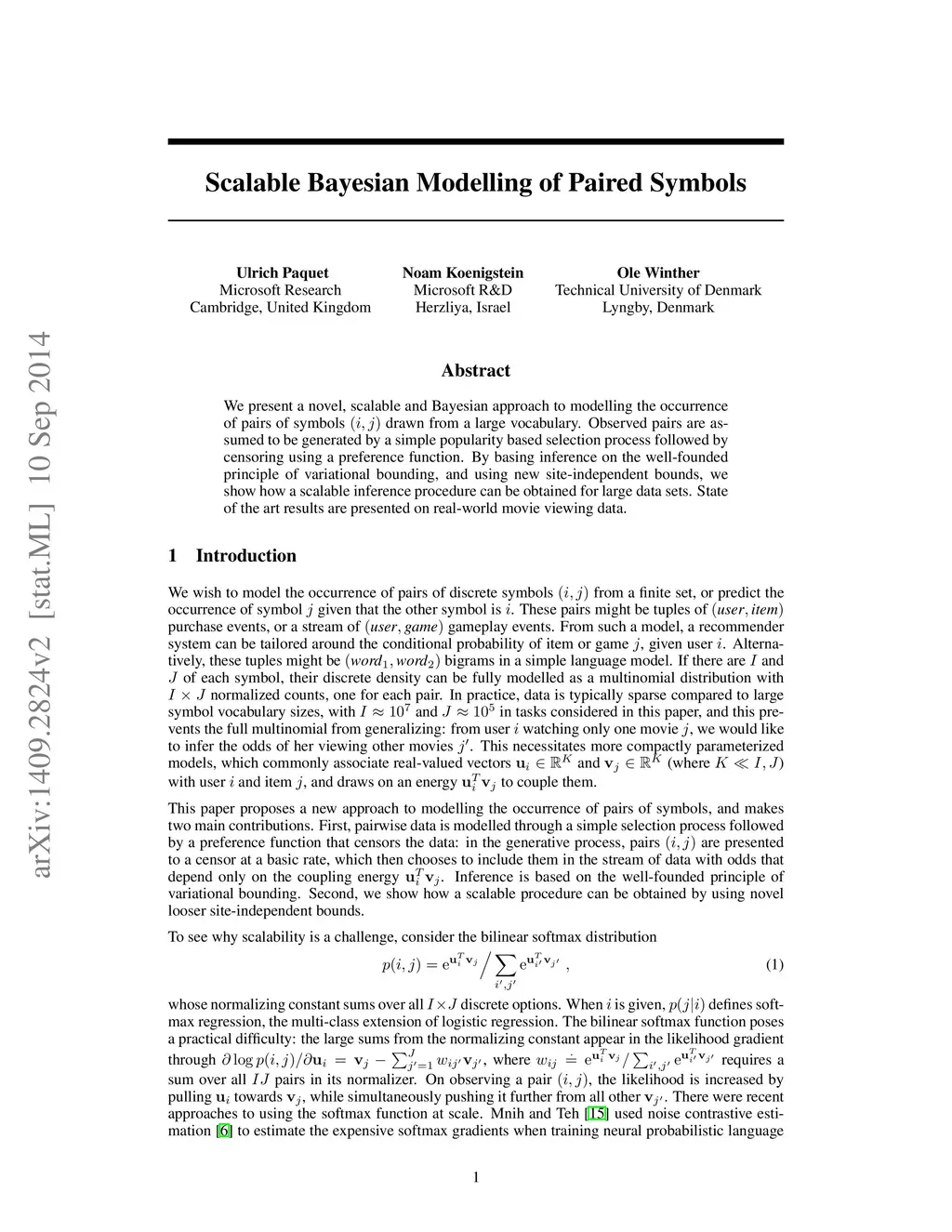 We present a novel, scalable and Bayesian approach to modelling the occurrence of pairs of symbols (i,j) drawn from a large vocabulary. Observed pairs are assumed to be generated by a simple popularity based selection process followed by censoring using a preference function. By basing inference on the well-founded principle of variational bounding, and using new site-independent bounds, we show how a scalable inference procedure can be obtained for large data sets. State of the art results are presented on real-world movie viewing data.