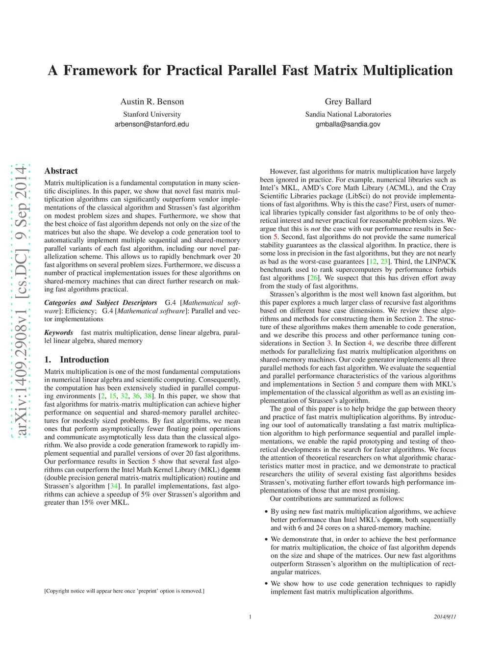 Matrix multiplication is a fundamental computation in many scientific disciplines. In this paper, we show that novel fast matrix multiplication algorithms can significantly outperform vendor implementations of the classical algorithm and Strassen's fast algorithm on modest problem sizes and shapes. Furthermore, we show that the best choice of fast algorithm depends not only on the size of the matrices but also the shape. We develop a code generation tool to automatically implement multiple sequential and shared-memory parallel variants of each fast algorithm, including our novel parallelization scheme. This allows us to rapidly benchmark over 20 fast algorithms on several problem sizes. Furthermore, we discuss a number of practical implementation issues for these algorithms on shared-memory machines that can direct further research on making fast algorithms practical.