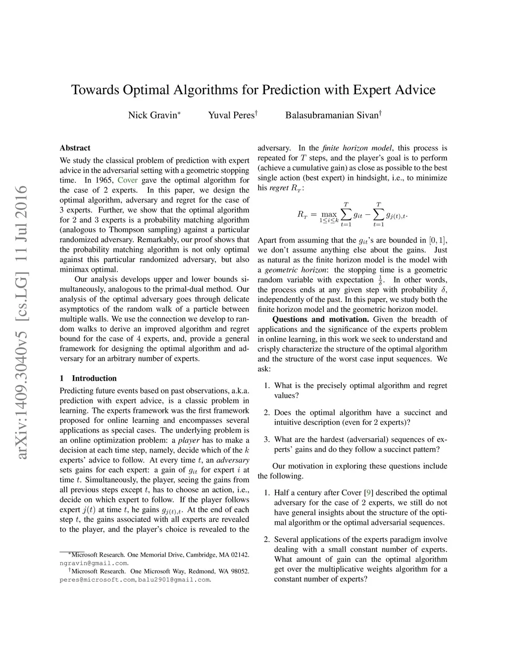 We study the classical problem of prediction with expert advice in the adversarial setting with a geometric stopping time. In 1965, Cover gave the optimal algorithm for the case of 2 experts. In this paper, we design the optimal algorithm, adversary and regret for the case of 3 experts. Further, we show that the optimal algorithm for and experts is a probability matching algorithm (analogous to Thompson sampling) against a particular randomized adversary. Remarkably, our proof shows that the probability matching algorithm is not only optimal against this particular randomized adversary, but also minimax optimal. Our analysis develops upper and lower bounds simultaneously, analogous to the primal-dual method. Our analysis of the optimal adversary goes through delicate asymptotics of the random walk of a particle between multiple walls. We use the connection we develop to random walks to derive an improved algorithm and regret bound for the case of experts, and, provide a general framework for designing the optimal algorithm and adversary for an arbitrary number of experts.