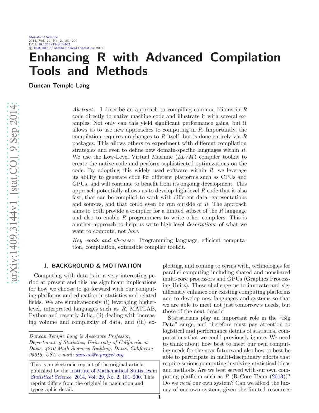 I describe an approach to compiling common idioms in R code directly to native machine code and illustrate it with several examples. Not only can this yield significant performance gains, but it allows us to use new approaches to computing in R. Importantly, the compilation requires no changes to R itself, but is done entirely via R packages. This allows others to experiment with different compilation strategies and even to define new domain-specific languages within R. We use the Low-Level Virtual Machine (LLVM) compiler toolkit to create the native code and perform sophisticated optimizations on the code. By adopting this widely used software within R, we leverage its ability to generate code for different platforms such as CPUs and GPUs, and will continue to benefit from its ongoing development. This approach potentially allows us to develop high-level R code that is also fast, that can be compiled to work with different data representations and sources, and that could even be run outside of R. The approach aims to both provide a compiler for a limited subset of the R language and also to enable R programmers to write other compilers. This is another approach to help us write high-level descriptions of what we want to compute, not how.