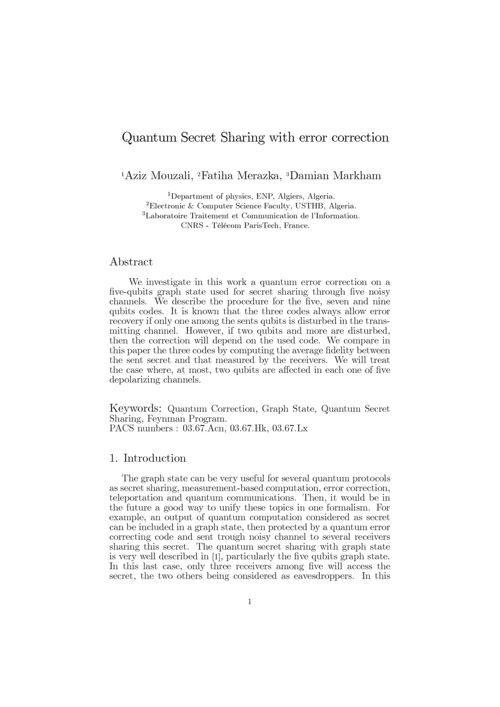We investigate in this work a quantum error correction on a five-qubits graph state used for secret sharing through five noisy channels. We describe the procedure for the five, seven and nine qubits codes. It is known that the three codes always allow error recovery if only one among the sents qubits is disturbed in the transmitting channel. However, if two qubits and more are disturbed, then the correction will depend on the used code.
