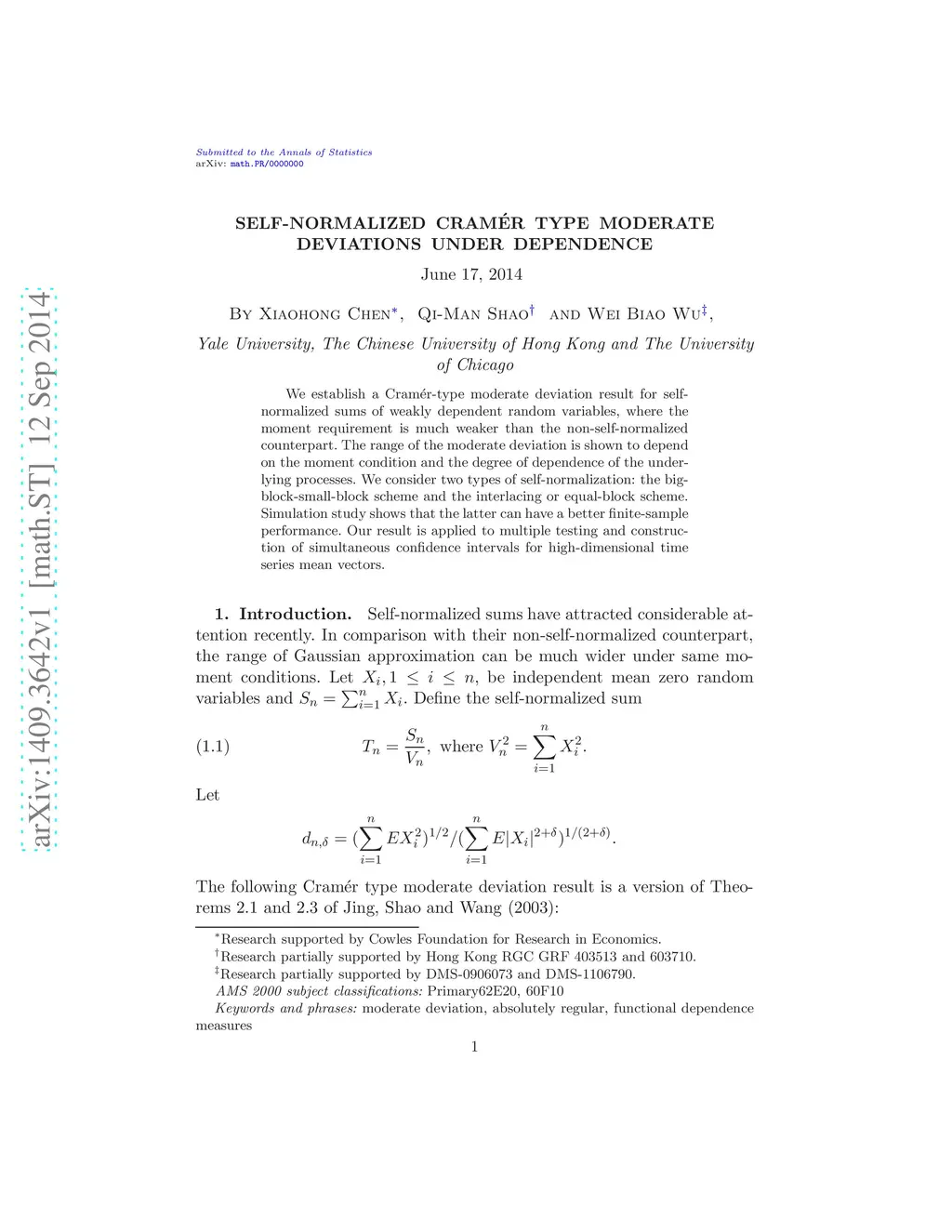 We establish a Cram\ér-type moderate deviation result for self-normalized sums of weakly dependent random variables, where the moment requirement is much weaker than the non-self-normalized counterpart. The range of the moderate deviation is shown to depend on the moment condition and the degree of dependence of the underlying processes. We consider two types of self-normalization: the big-block-small-block scheme and the interlacing or equal-block scheme. Simulation study shows that the latter can have a better finite-sample performance. Our result is applied to multiple testing and construction of simultaneous confidence intervals for high-dimensional time series mean vectors.