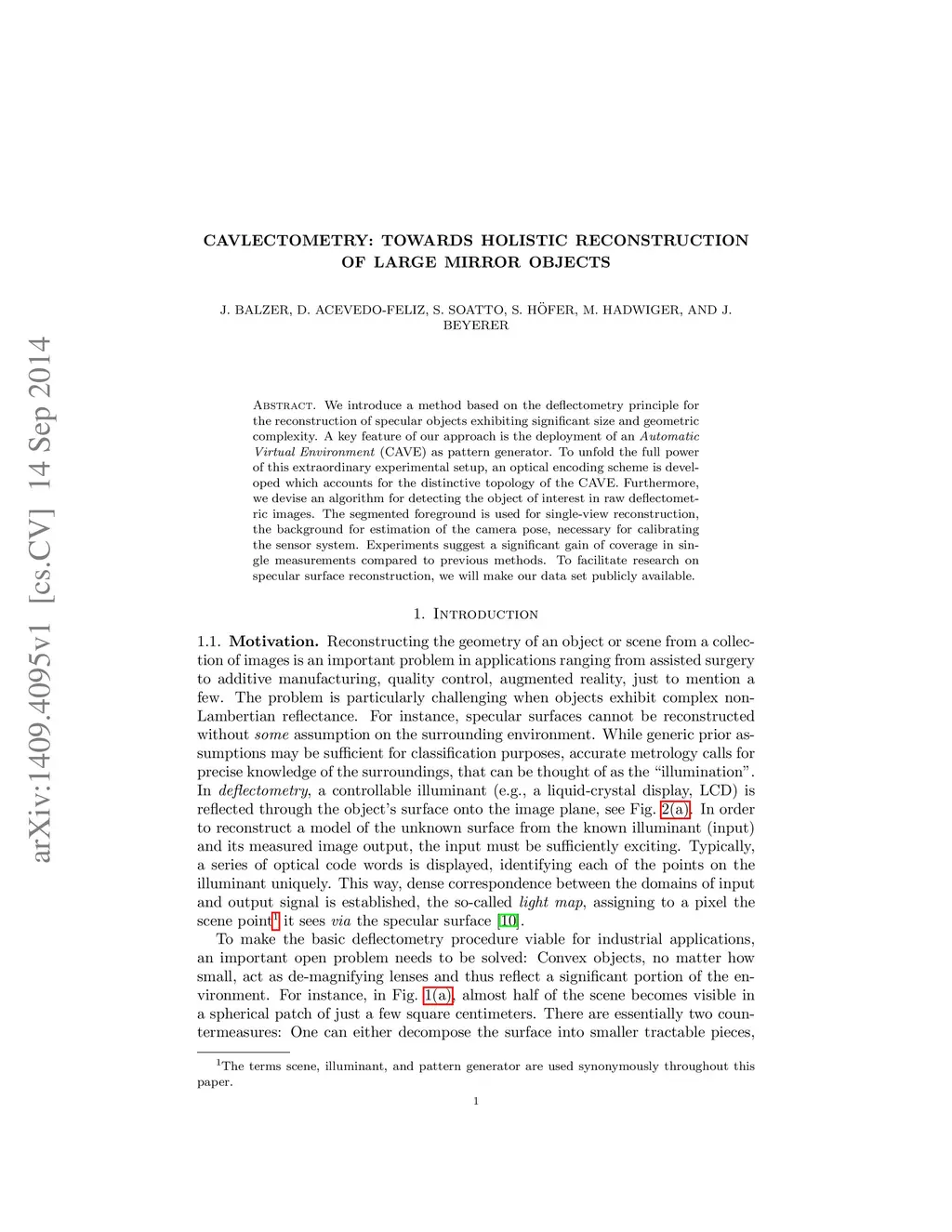 We introduce a method based on the deflectometry principle for the reconstruction of specular objects exhibiting significant size and geometric complexity. A key feature of our approach is the deployment of an Automatic Virtual Environment (CAVE) as pattern generator. To unfold the full power of this extraordinary experimental setup, an optical encoding scheme is developed which accounts for the distinctive topology of the CAVE. Furthermore, we devise an algorithm for detecting the object of interest in raw deflectometric images. The segmented foreground is used for single-view reconstruction, the background for estimation of the camera pose, necessary for calibrating the sensor system. Experiments suggest a significant gain of coverage in single measurements compared to previous methods. To facilitate research on specular surface reconstruction, we will make our data set publicly available.