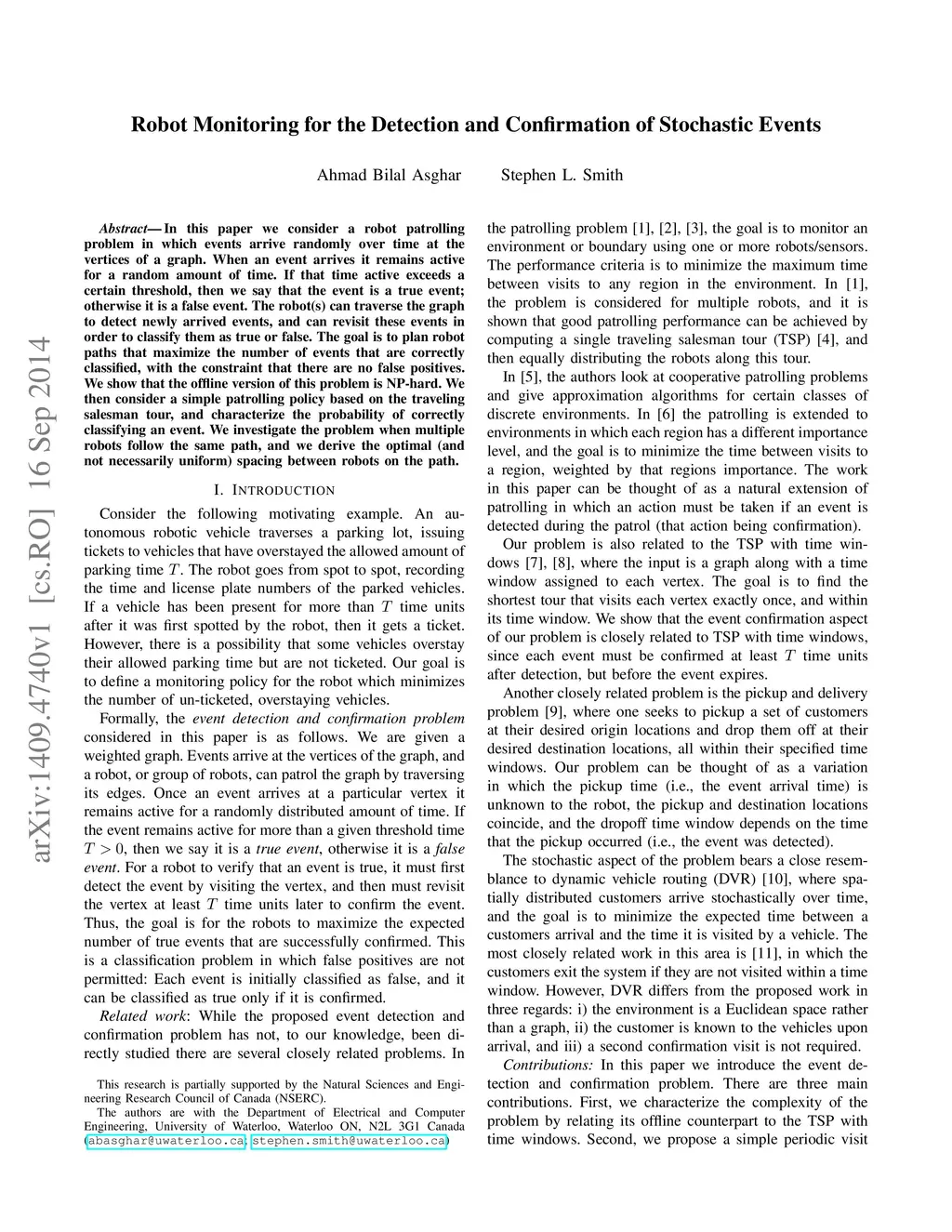 In this paper we consider a robot patrolling problem in which events arrive randomly over time at the vertices of a graph. When an event arrives it remains active for a random amount of time. If that time active exceeds a certain threshold, then we say that the event is a true event; otherwise it is a false event. The robot(s) can traverse the graph to detect newly arrived events, and can revisit these events in order to classify them as true or false. The goal is to plan robot paths that maximize the number of events that are correctly classified, with the constraint that there are no false positives. We show that the offline version of this problem is NP-hard. We then consider a simple patrolling policy based on the traveling salesman tour, and characterize the probability of correctly classifying an event. We investigate the problem when multiple robots follow the same path, and we derive the optimal (and not necessarily uniform) spacing between robots on the path.
