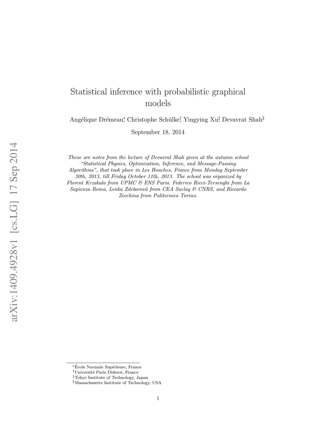 These are notes from the lecture of Devavrat Shah given at the autumn school "Statistical Physics, Optimization, Inference, and Message-Passing Algorithms", that took place in Les Houches, France from Monday September 30th, 2013, till Friday October 11th, 2013. The school was organized by Florent Krzakala from UPMC & ENS Paris, Federico Ricci-Tersenghi from La Sapienza Roma, Lenka Zdeborova from CEA Saclay & CNRS, and Riccardo Zecchina from Politecnico Torino. This lecture of Devavrat Shah (MIT) covers the basics of inference and learning. It explains how inference problems are represented within structures known as graphical models. The theoretical basis of the belief propagation algorithm is then explained and derived. This lecture sets the stage for generalizations and applications of message passing algorithms.
