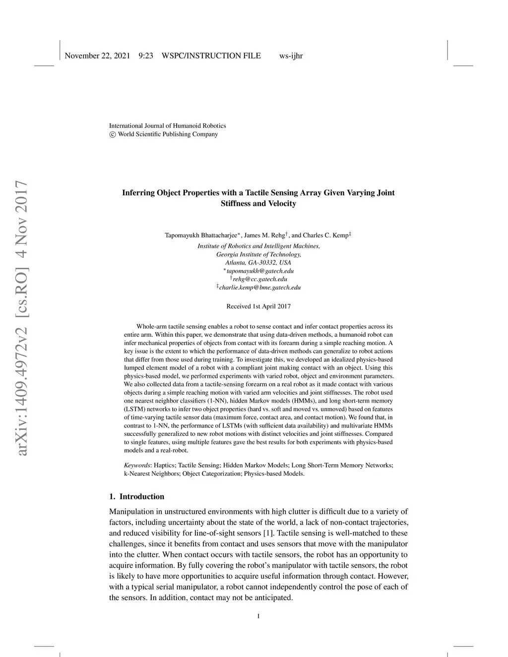 Whole-arm tactile sensing enables a robot to sense contact and infer contact properties across its entire arm. Within this paper, we demonstrate that using data-driven methods, a humanoid robot can infer mechanical properties of objects from contact with its forearm during a simple reaching motion. A key issue is the extent to which the performance of data-driven methods can generalize to robot actions that differ from those used during training. To investigate this, we developed an idealized physics-based lumped element model of a robot with a compliant joint making contact with an object. Using this physics-based model, we performed experiments with varied robot, object and environment parameters. We also collected data from a tactile-sensing forearm on a real robot as it made contact with various objects during a simple reaching motion with varied arm velocities and joint stiffnesses. The robot used one nearest neighbor classifiers (1-NN), hidden Markov models (HMMs), and long short-term memory (LSTM) networks to infer two object properties (hard vs. soft and moved vs. unmoved) based on features of time-varying tactile sensor data (maximum force, contact area, and contact motion). We found that, in contrast to 1-NN, the performance of LSTMs (with sufficient data availability) and multivariate HMMs successfully generalized to new robot motions with distinct velocities and joint stiffnesses. Compared to single features, using multiple features gave the best results for both experiments with physics-based models and a real-robot.