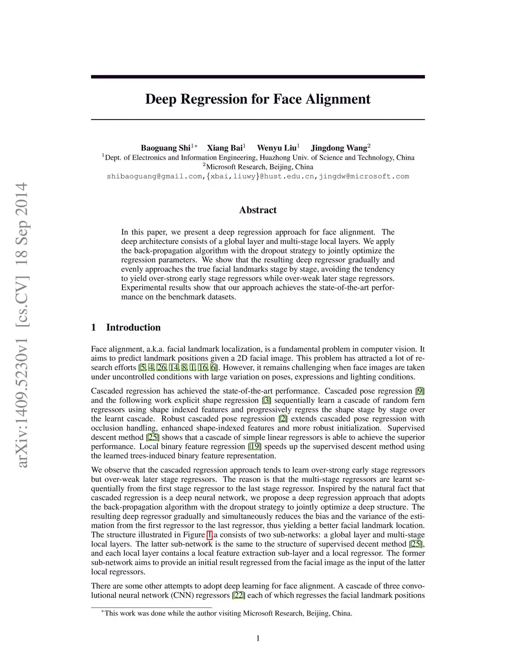 In this paper, we present a deep regression approach for face alignment. The deep architecture consists of a global layer and multi-stage local layers. We apply the back-propagation algorithm with the dropout strategy to jointly optimize the regression parameters. We show that the resulting deep regressor gradually and evenly approaches the true facial landmarks stage by stage, avoiding the tendency to yield over-strong early stage regressors while over-weak later stage regressors. Experimental results show that our approach achieves the state-of-the-art