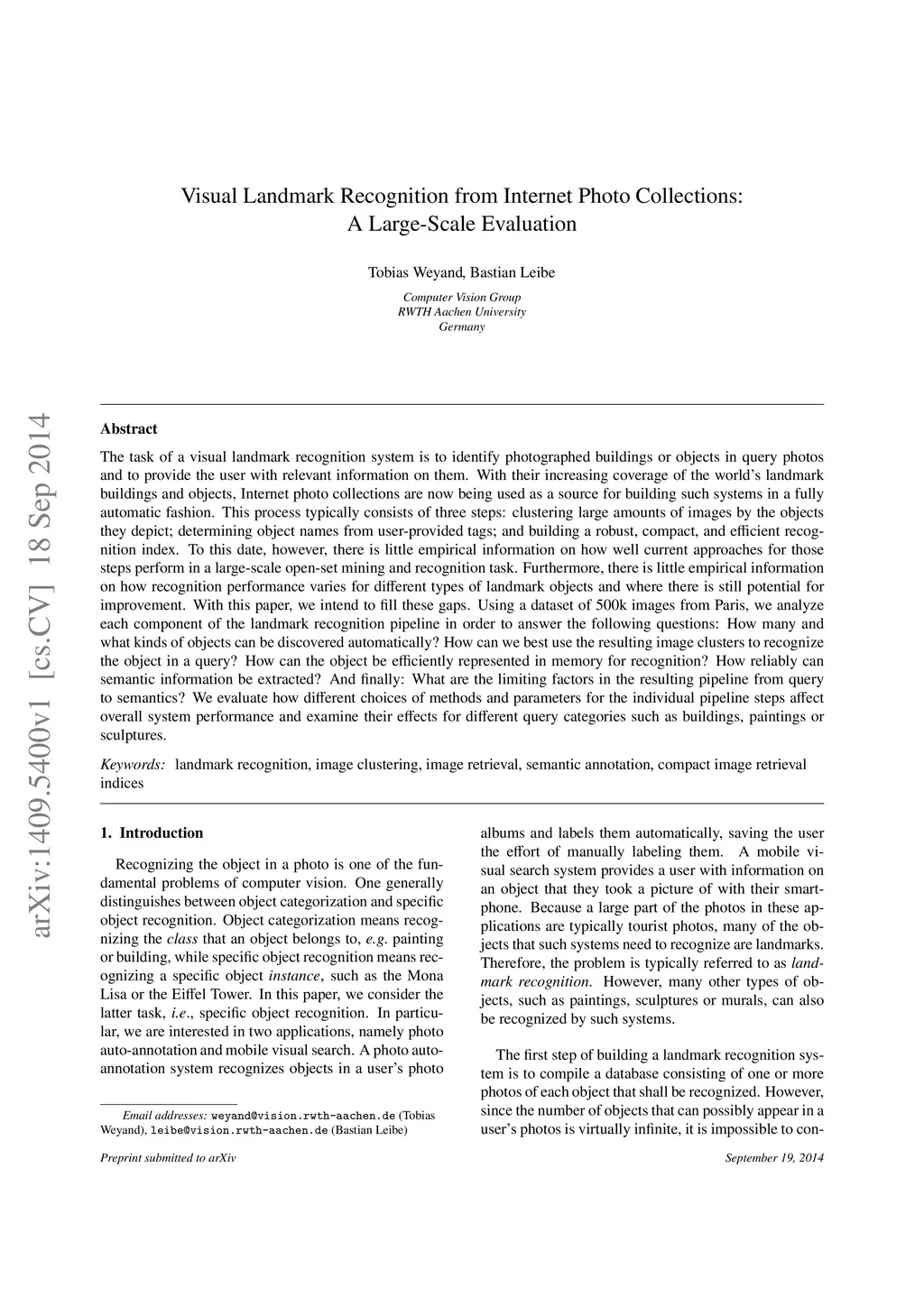 Visual Landmark Recognition from Internet Photo Collections: A