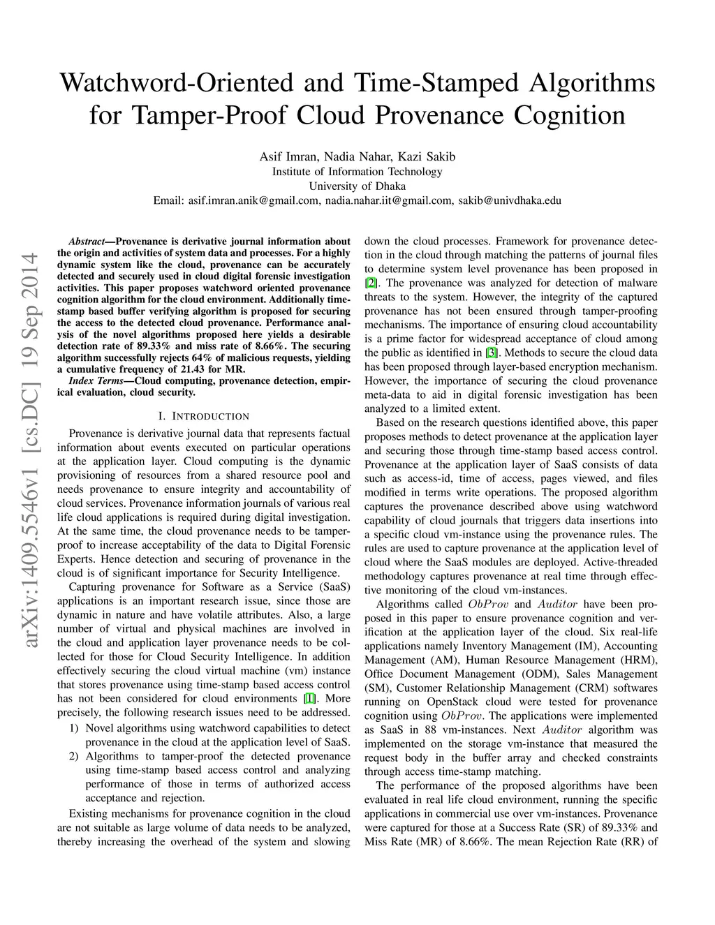 Provenance is derivative journal information about the origin and activities of system data and processes. For a highly dynamic system like the cloud, provenance can be accurately detected and securely used in cloud digital forensic investigation activities. This paper proposes watchword oriented provenance cognition algorithm for the cloud environment. Additionally time-stamp based buffer verifying algorithm is proposed for securing the access to the detected cloud provenance. Performance analysis of the novel algorithms proposed here yields a desirable detection rate of 89.33% and miss rate of 8.66%. The securing algorithm successfully rejects 64% of malicious requests, yielding a cumulative frequency of 21.43 for MR.