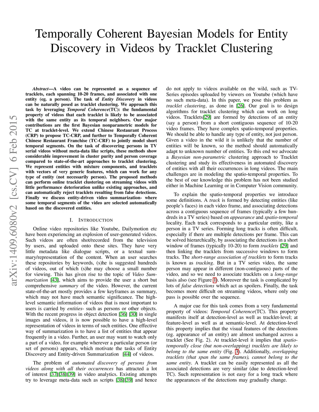 A video can be represented as a sequence of tracklets, each spanning 10-20 frames, and associated with one entity (eg. a person). The task of \emph{Entity Discovery} in videos can be naturally posed as tracklet clustering. We approach this task by leveraging \emph{Temporal Coherence}(TC): the fundamental property of videos that each tracklet is likely to be associated with the same entity as its temporal neighbors. Our major contributions are the first Bayesian nonparametric models for TC at tracklet-level. We extend Chinese Restaurant Process (CRP) to propose TC-CRP, and further to Temporally Coherent Chinese Restaurant Franchise (TC-CRF) to jointly model short temporal segments. On the task of discovering persons in TV serial videos without meta-data like scripts, these methods show considerable improvement in cluster purity and person coverage compared to state-of-the-art approaches to tracklet clustering. We represent entities with mixture components, and tracklets with vectors of very generic features, which can work for any type of entity (not necessarily person). The proposed methods can perform online tracklet clustering on streaming videos with little performance deterioration unlike existing approaches, and can automatically reject tracklets resulting from false detections. Finally we discuss entity-driven video summarization- where some temporal segments of the video are selected automatically based on the discovered entities.