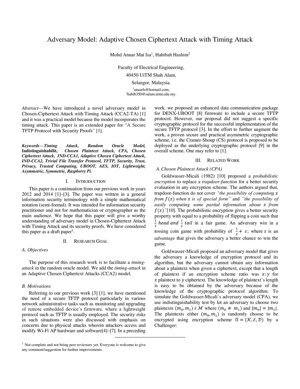 We have introduced a novel adversary model in Chosen-Ciphertext Attack with Timing Attack (CCA2-TA) and it was a practical model because the model incorporates the timing attack. This paper is an extended paper for Á Secure TFTP Protocol with Security Proofs'. Keywords - Timing Attack, Random Oracle Model, Indistinguishabilit, Chosen Plaintext Attack, CPA, Chosen Ciphertext Attack, IND-CCA1, Adaptive Chosen Ciphertext Attack, IND-CCA2, Trivial File Transfer Protocol, TFTP, Security, Trust, Privacy, Trusted Computing, UBOOT, AES, IOT, Lightweight, Asymmetric, Symmetric, Raspberry Pi, ARM.