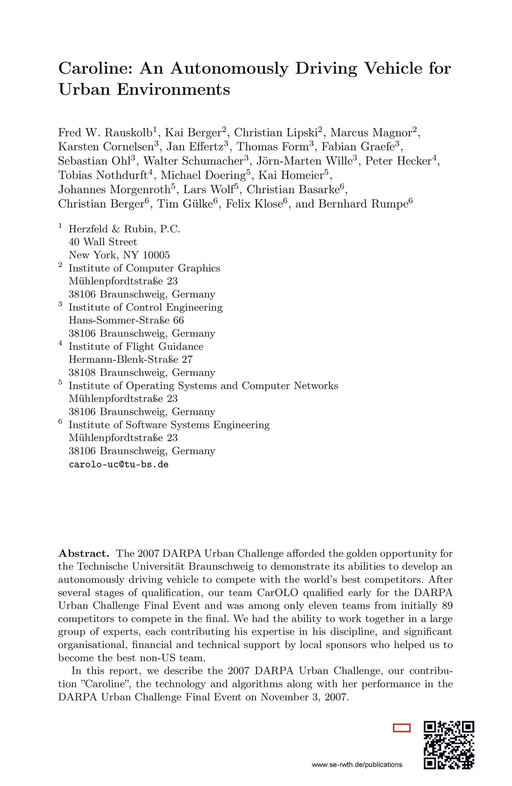 The 2007 DARPA Urban Challenge afforded the golden opportunity for the Technische Universit\"at Braunschweig to demonstrate its abilities to develop an autonomously driving vehicle to compete with the world's best competitors. After several stages of qualification, our team CarOLO qualified early for the DARPA Urban Challenge Final Event and was among only eleven teams from initially 89 competitors to compete in the final. We had the ability to work together in a large group of experts, each contributing his expertise in his discipline, and significant organisational, financial and technical support by local sponsors who helped us to become the best non-US team. In this report, we describe the 2007 DARPA Urban Challenge, our contribution "Caroline", the technology and algorithms along with her performance in the DARPA Urban Challenge Final Event on November 3, 2007.