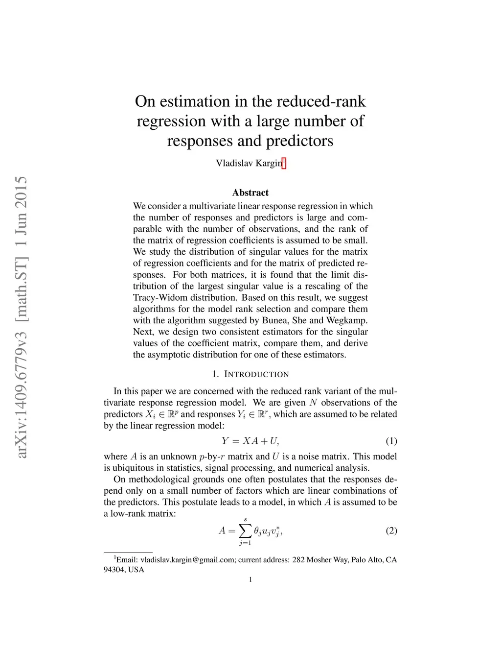 We consider a multivariate linear response regression in which the number of responses and predictors is large and comparable with the number of observations, and the rank of the matrix of regression coefficients is assumed to be small. We study the distribution of singular values for the matrix of regression coefficients and for the matrix of predicted responses. For both matrices, it is found that the limit distribution of the largest singular value is a rescaling of the Tracy-Widom distribution. Based on this result, we suggest algorithms for the model rank selection and compare them with the algorithm suggested by Bunea, She and Wegkamp. Next, we design two consistent estimators for the singular values of the coefficient matrix, compare them, and derive the asymptotic distribution for one of these estimators..