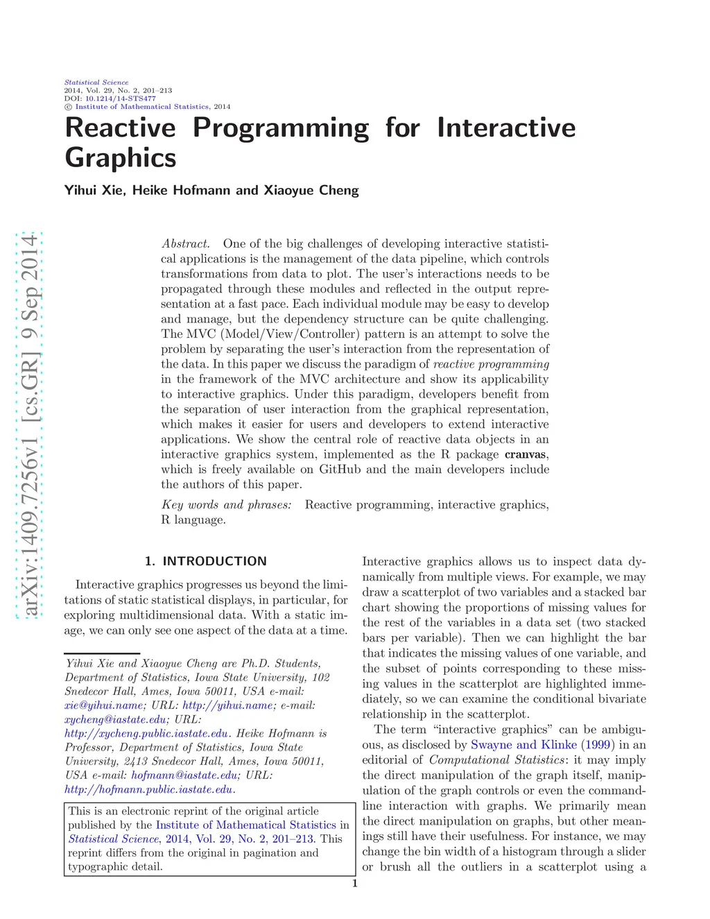 One of the big challenges of developing interactive statistical applications is the management of the data pipeline, which controls transformations from data to plot. The user's interactions needs to be propagated through these modules and reflected in the output representation at a fast pace. Each individual module may be easy to develop and manage, but the dependency structure can be quite challenging. The MVC (Model/View/Controller) pattern is an attempt to solve the problem by separating the user's interaction from the representation of the data. In this paper we discuss the paradigm of reactive programming in the framework of the MVC architecture and show its applicability to interactive graphics. Under this paradigm, developers benefit from the separation of user interaction from the graphical representation, which makes it easier for users and developers to extend interactive applications. We show the central role of reactive data objects in an interactive graphics system, implemented as the R package cranvas, which is freely available on GitHub and the main developers include the authors of this paper.