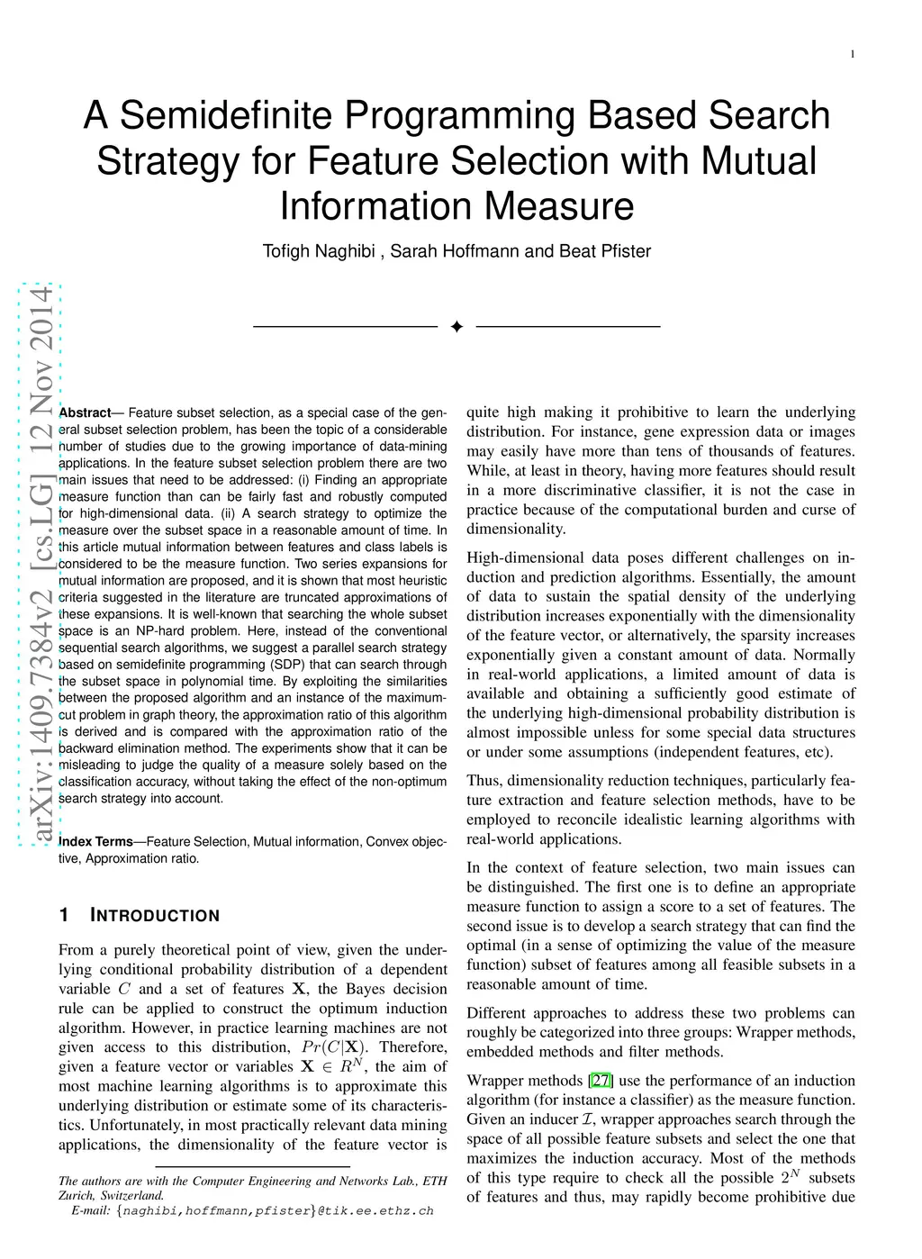 A Semidefinite Programming Based Search Strategy for Feature Selection